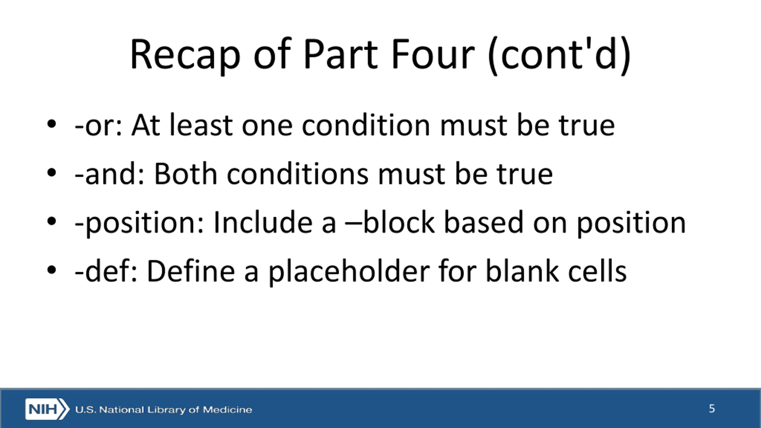 Recap of Part Four (cont'd) -or: At least one condition must be true -and: Both conditions must be true -position: Include a block based on position -def: Define a placeholder for blank cells 5