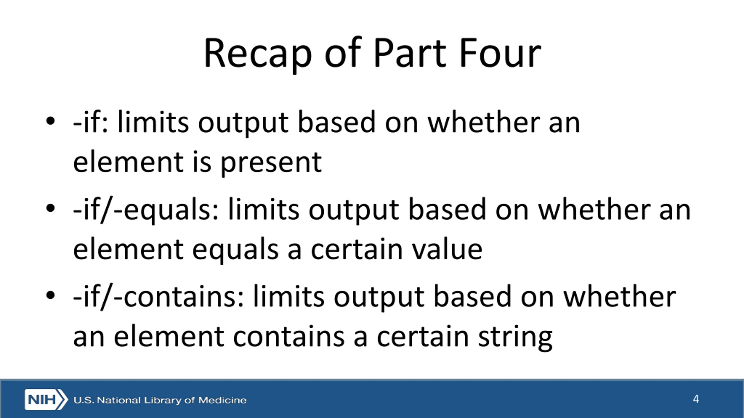 Recap of Part Four -if: limits output based on whether an element is present -if/-equals: limits output based on whether an element equals a certain value -if/-contains: limits output based on whether an element contains a certain string 4