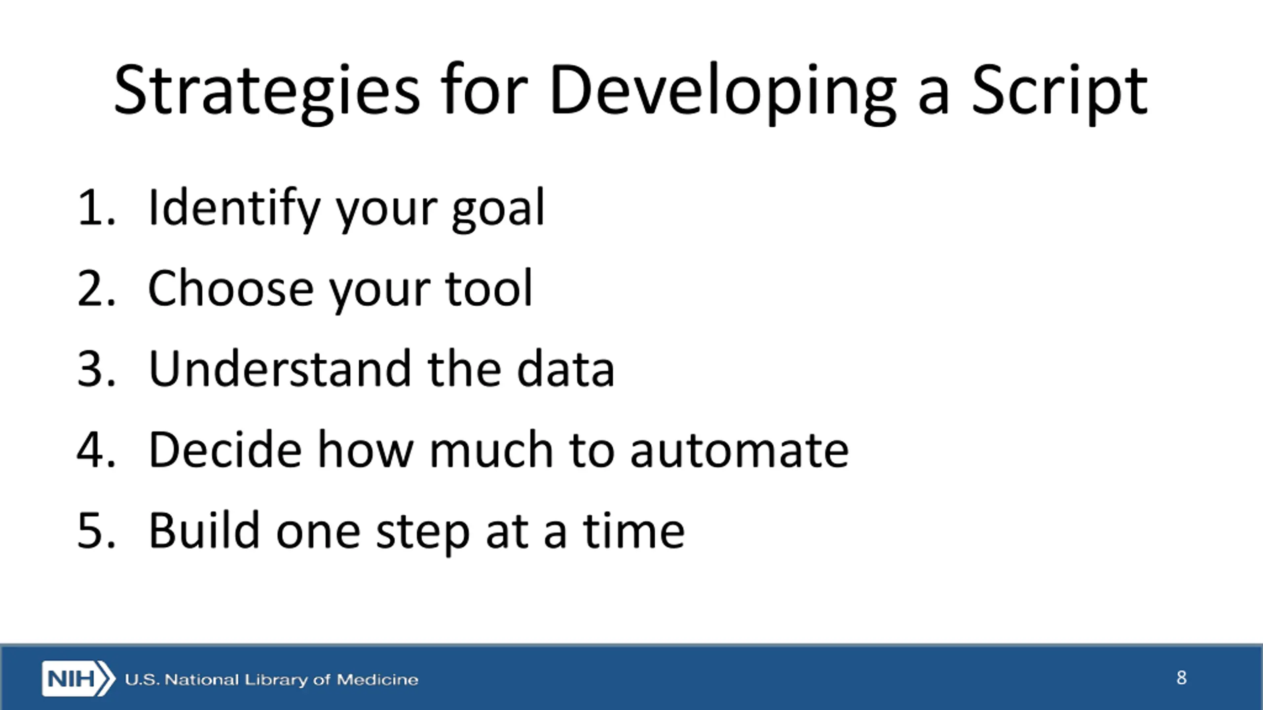 Strategies for Developing a Script 1. Identify your goal 2. Choose your tool 3. Understand the data 4. Decide how much to automate 5. Build one step at a time 8