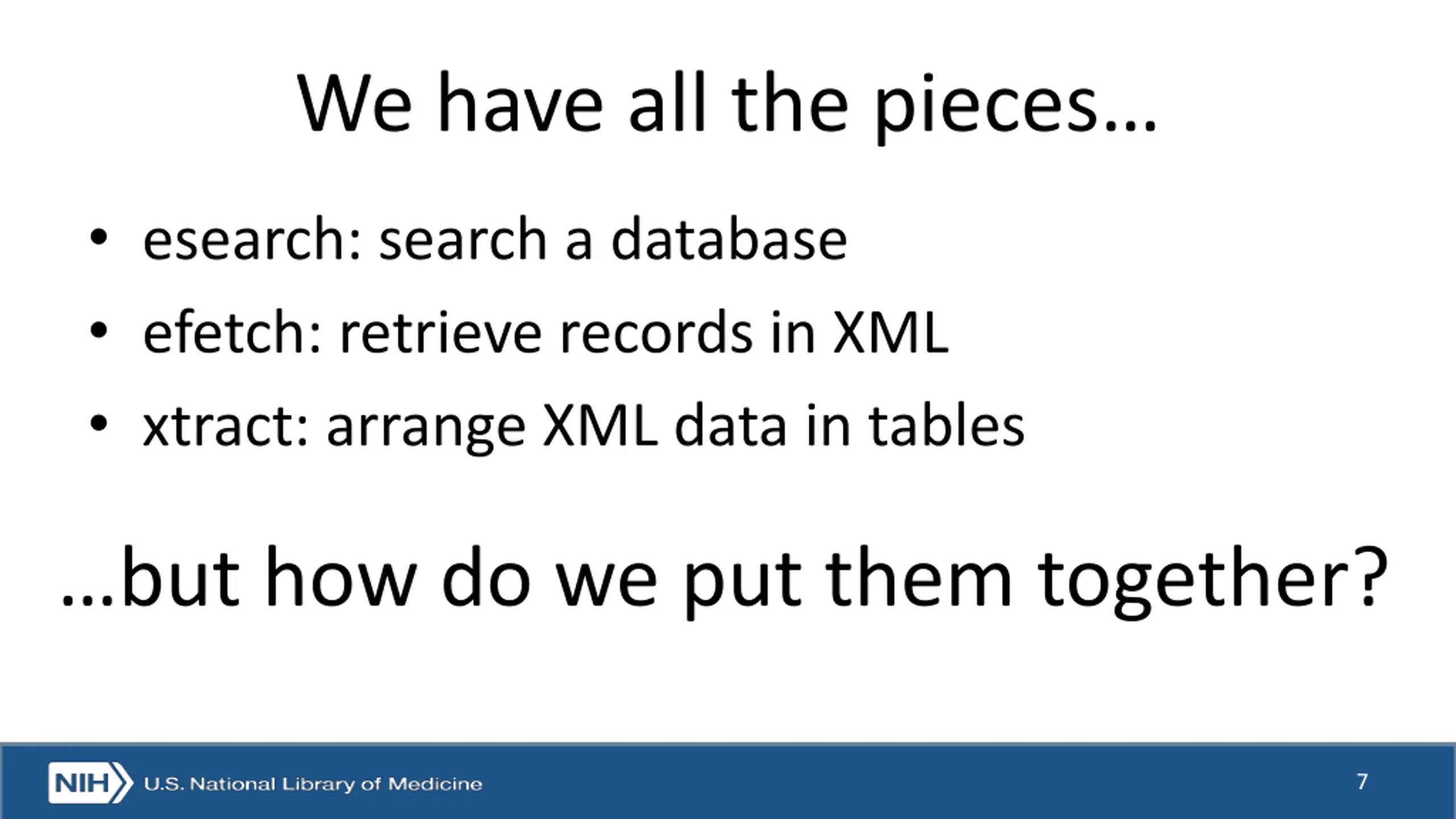 We have all the pieces esearch: search a database efetch: retrieve records in XML xtract: arrange XML data in tables but how do we put them together? 7