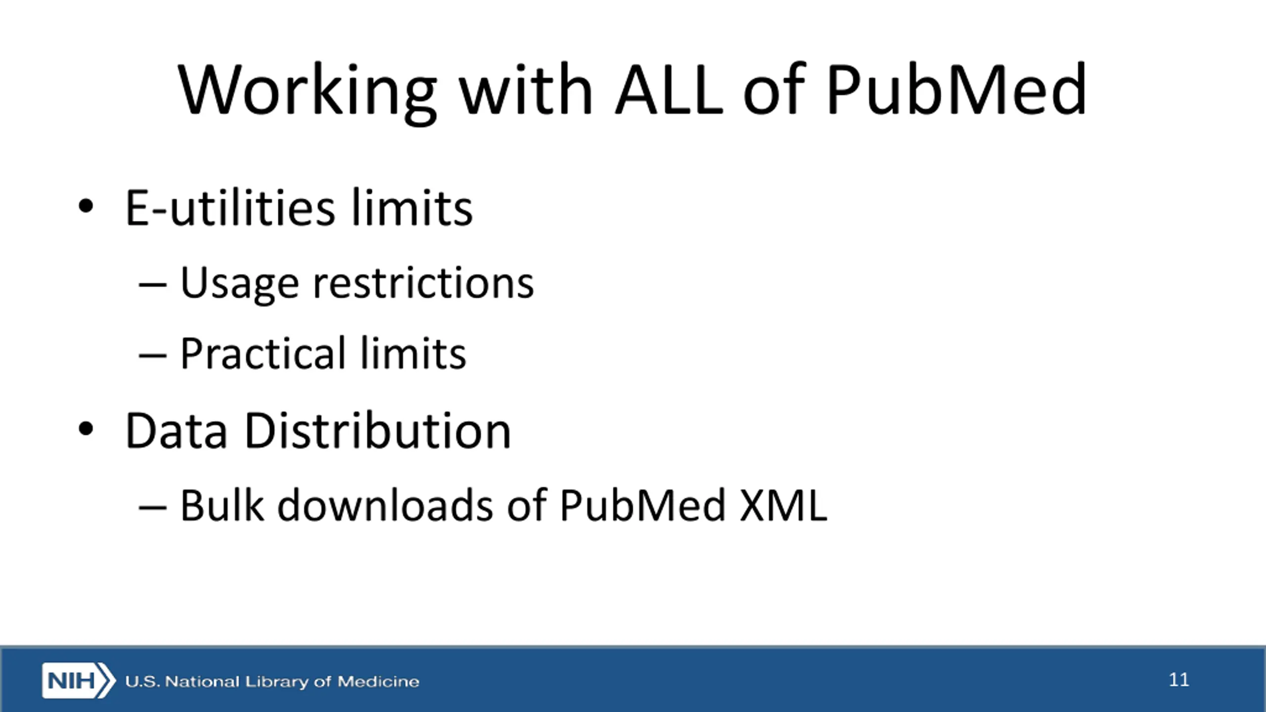 Working with ALL of PubMed E-utilities limits Usage restrictions Practical limits Data Distribution Bulk downloads of PubMed XML 11