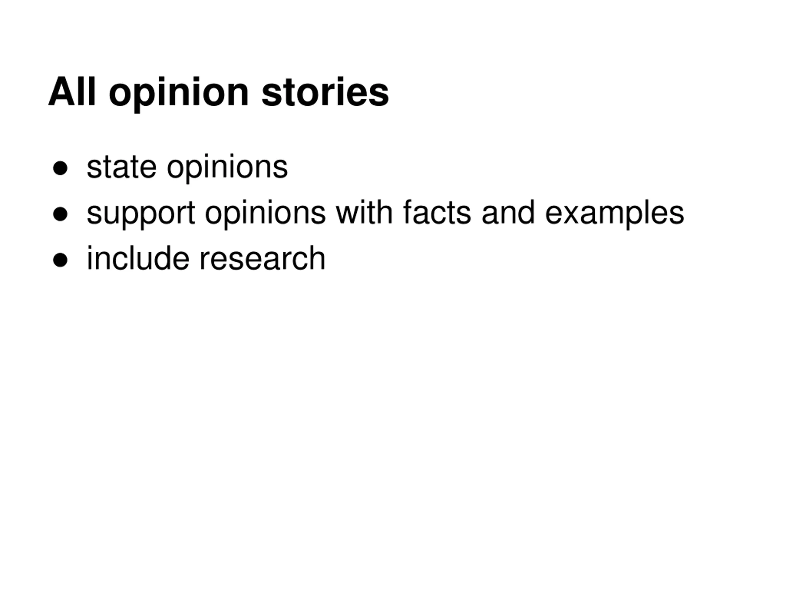 All opinion stories state opinions support opinions with facts and examples include research
