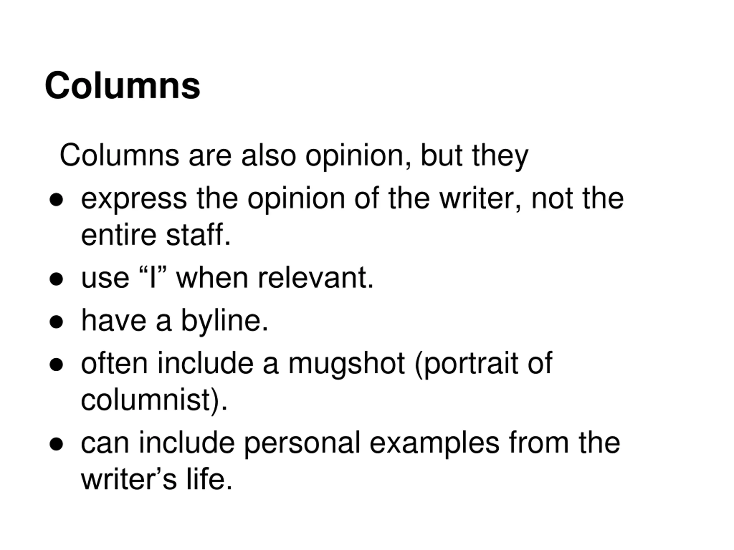 Columns Columns are also opinion, but they express the opinion of the writer, not the entire staff. use I when relevant. have a byline. often include a mugshot (portrait of columnist). can include personal examples from the writer s life.