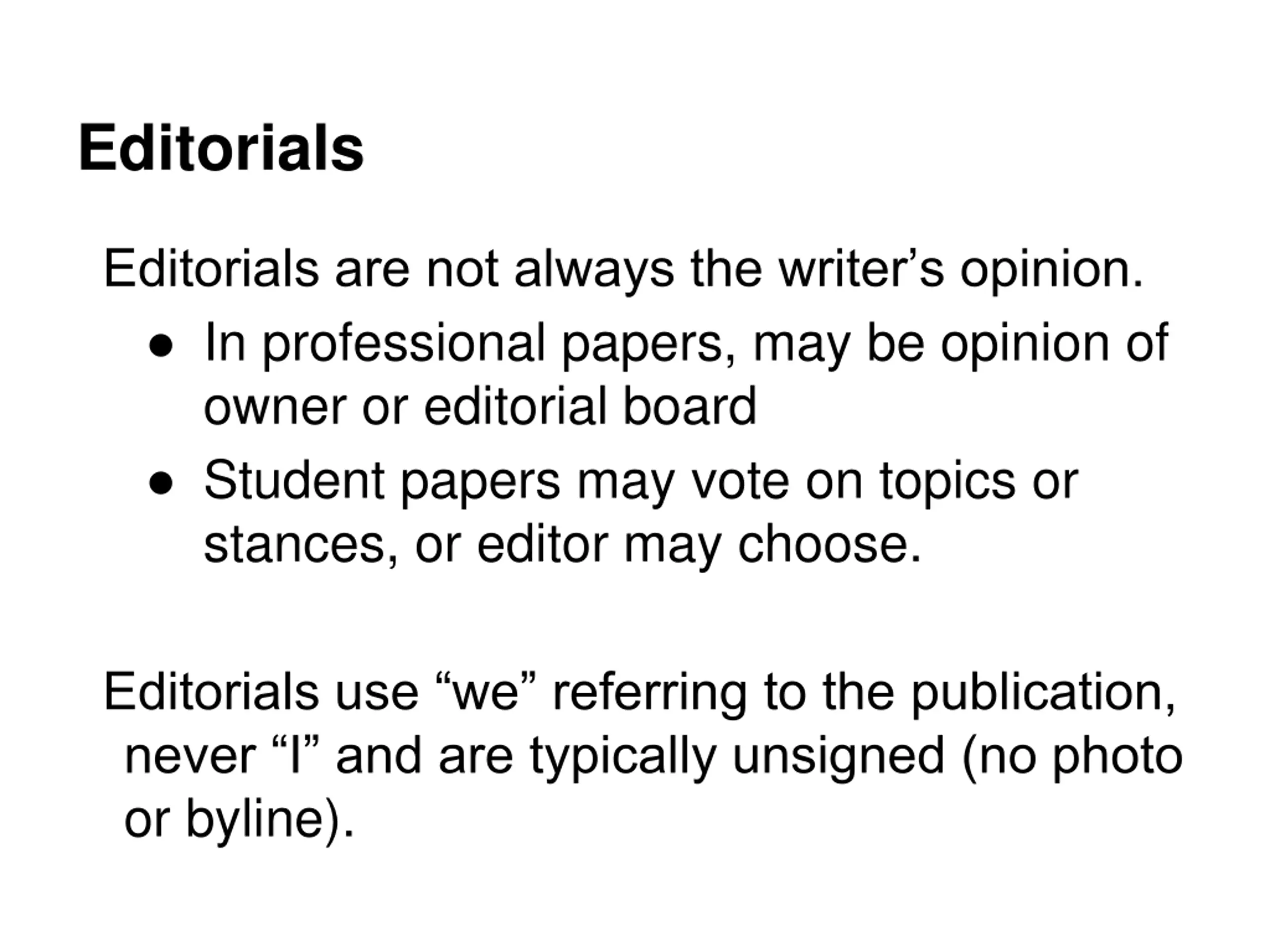 Editorials Editorials are not always the writer s opinion. In professional papers, may be opinion of owner or editorial board Student papers may vote on topics or stances, or editor may choose. Editorials use we referring to the publication, never I and are typically unsigned (no photo or byline).