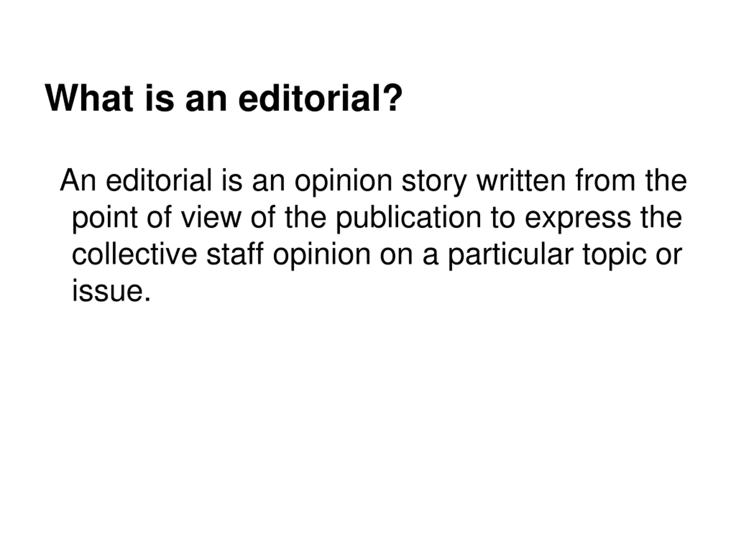 What is an editorial? An editorial is an opinion story written from the point of view of the publication to express the collective staff opinion on a particular topic or issue.