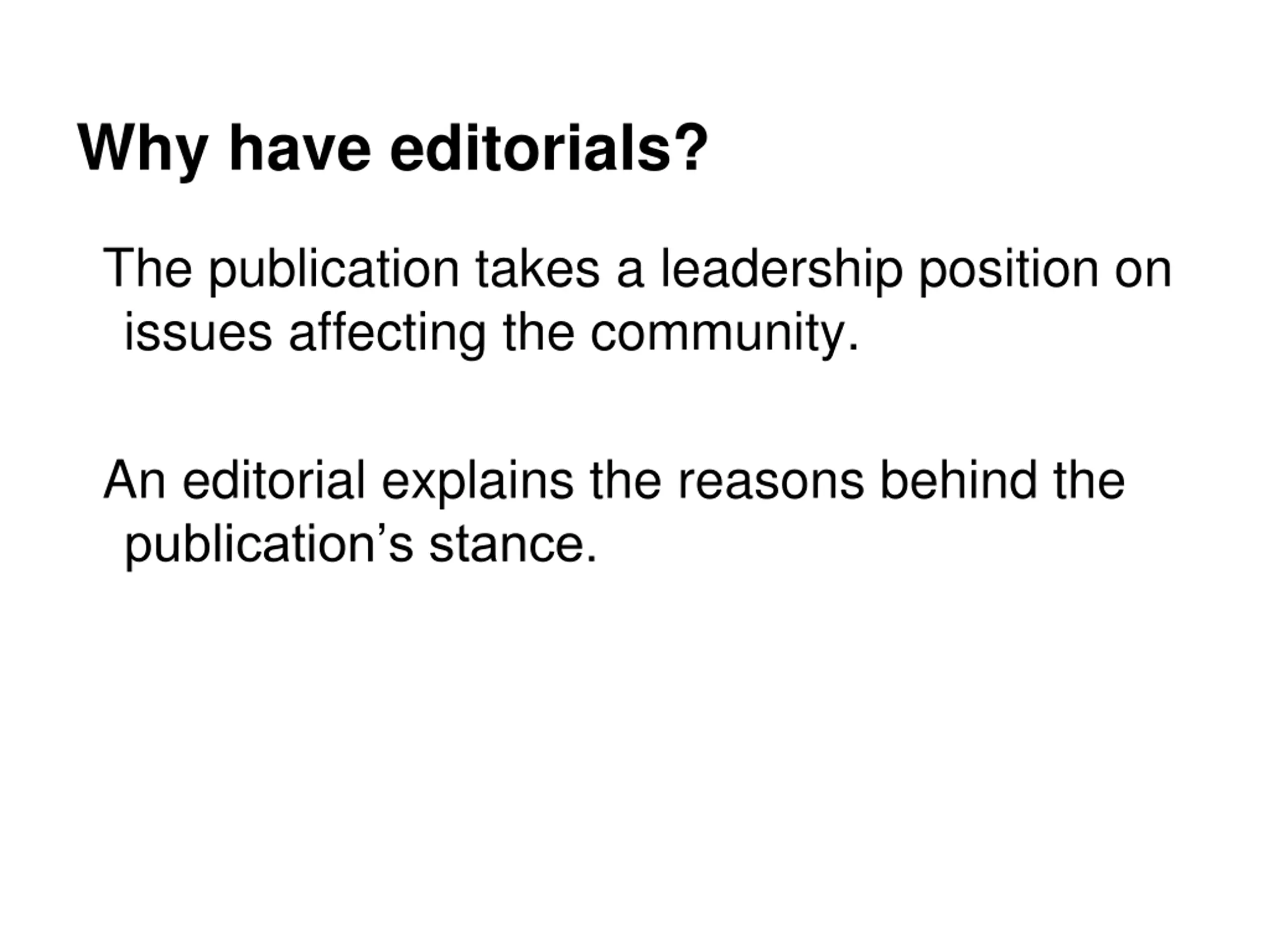 Why have editorials? The publication takes a leadership position on issues affecting the community. An editorial explains the reasons behind the publication s stance.