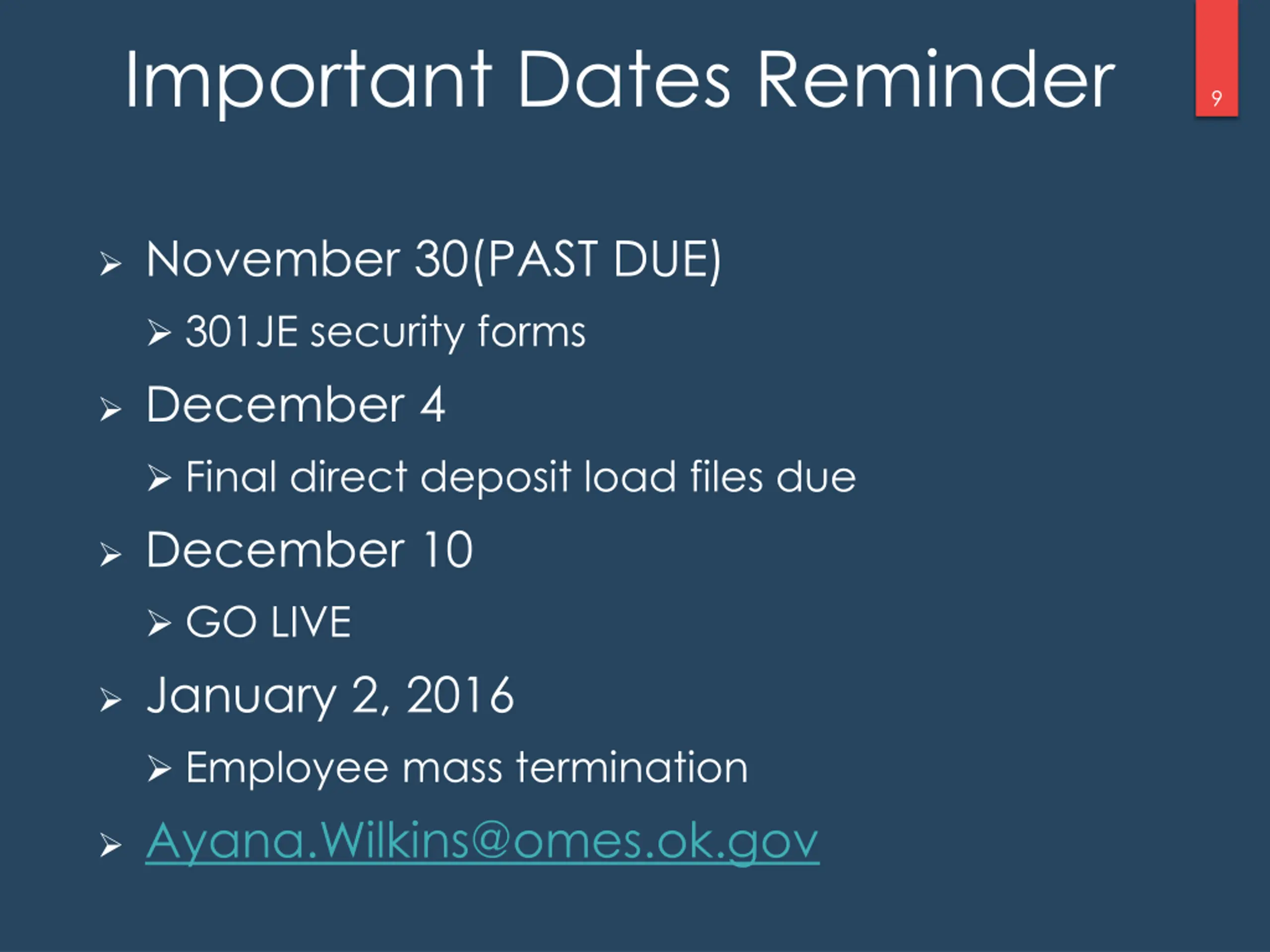 Important Dates Reminder 9 November 30(PAST DUE) 301JE security forms December 4 Final direct deposit load files due December 10 GO LIVE January 2, 2016 Employee mass termination Ayana.Wilkins@omes.ok.gov