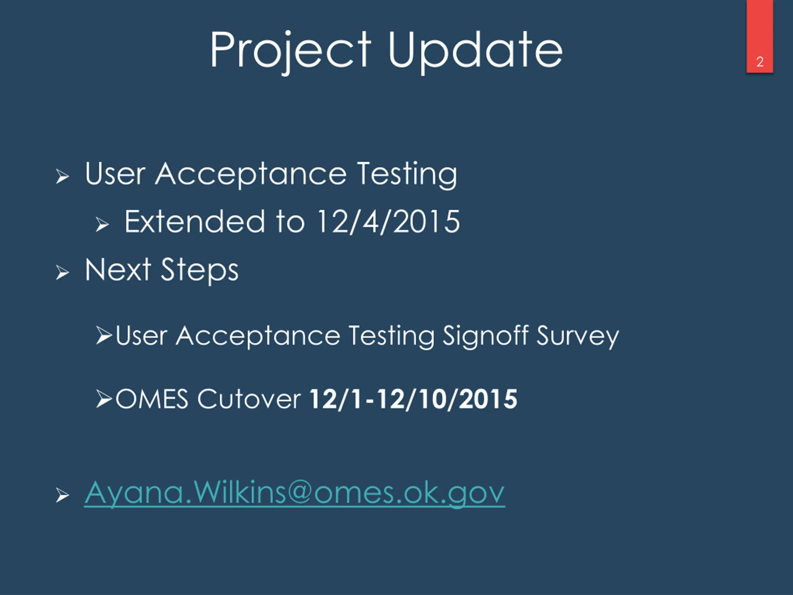 Project Update 2 User Acceptance Testing Extended to 12/4/2015 Next Steps User Acceptance Testing Signoff Survey OMES Cutover 12/1-12/10/2015 Ayana.Wilkins@omes.ok.gov