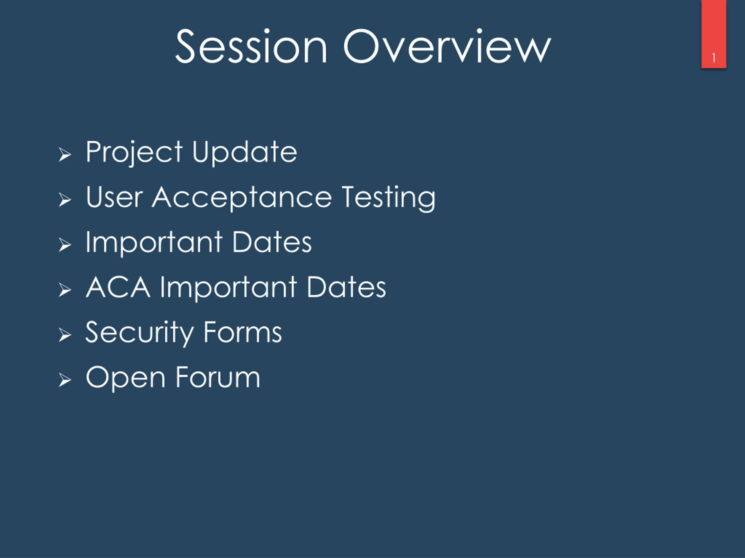 Session Overview 1 Project Update User Acceptance Testing Important Dates ACA Important Dates Security Forms Open Forum