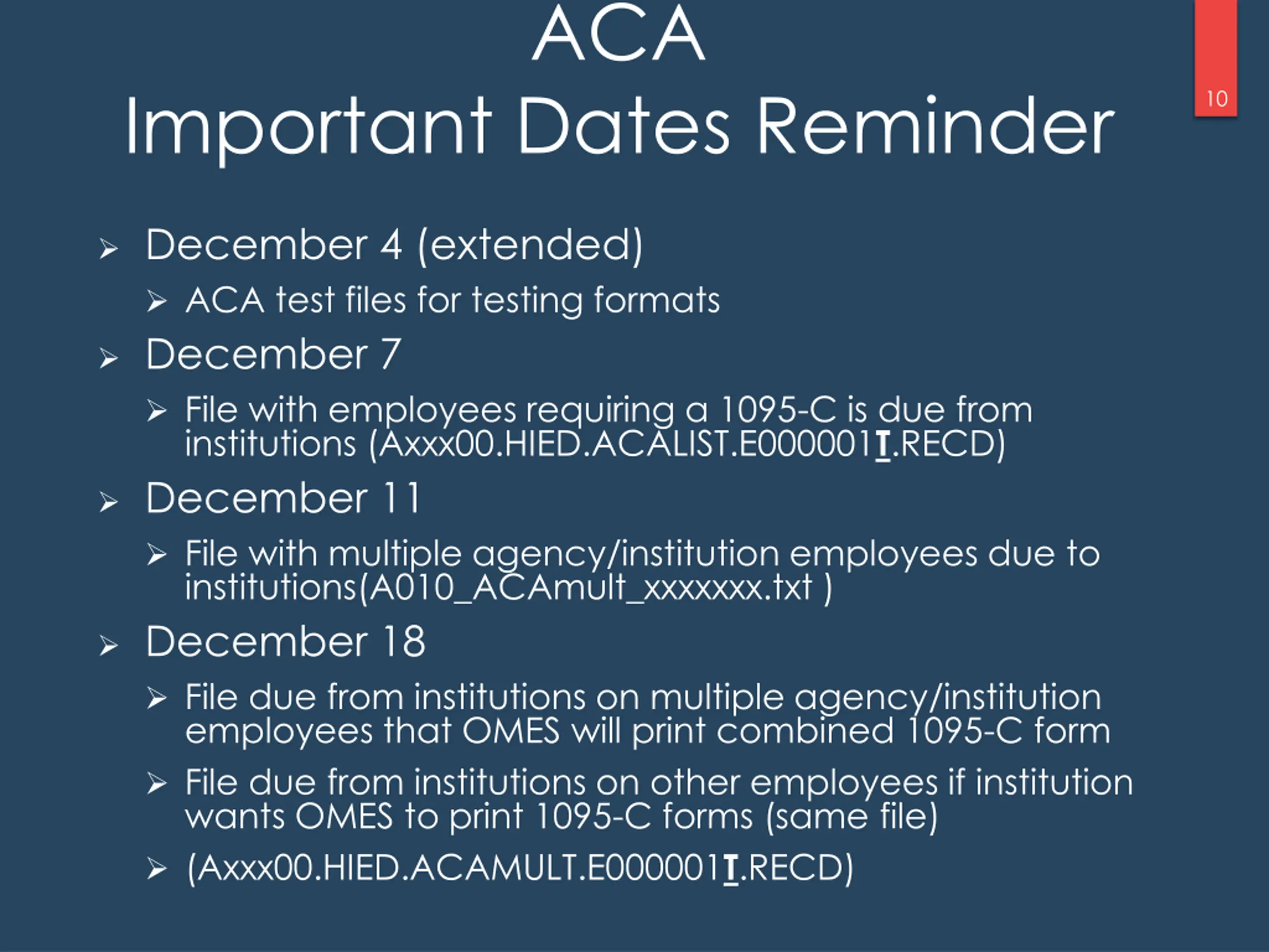 ACA Important Dates Reminder 10 December 4 (extended) ACA test files for testing formats December 7 File with employees requiring a 1095-C is due from institutions (Axxx00.HIED.ACALIST.E000001T.RECD) December 11 File with multiple agency/institution employees due to institutions(A010_ACAmult_xxxxxxx.txt ) December 18 File due from institutions on multiple agency/institution employees that OMES will print combined 1095-C form File due from institutions on other employees if institution wants OMES to print 1095-C forms (same file) (Axxx00.HIED.ACAMULT.E000001T.RECD)