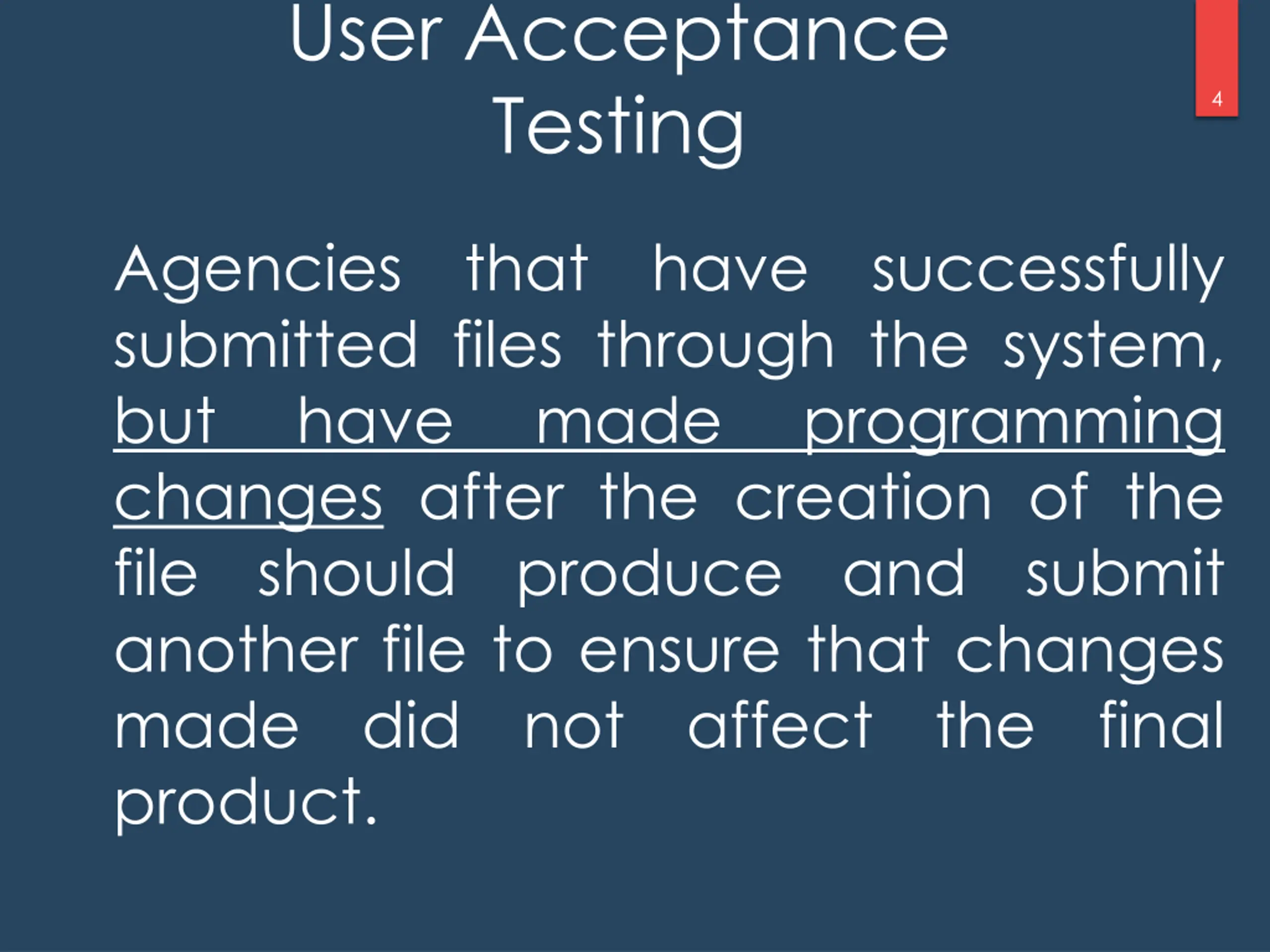 User Acceptance Testing 4 Agencies that have successfully submitted files through the system, but have made changes after the creation of the file should produce and submit another file to ensure that changes made did not affect the final product. programming
