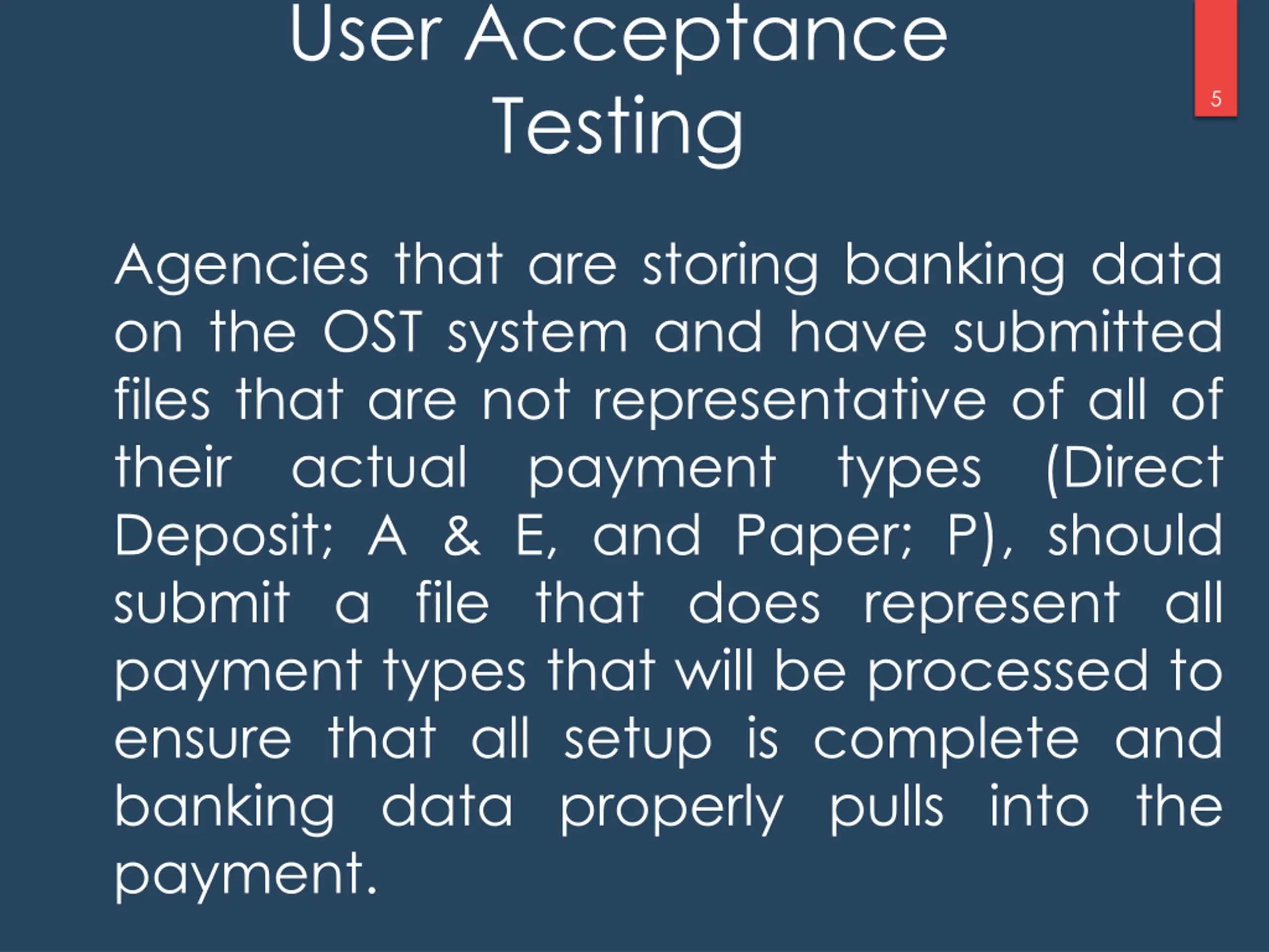 User Acceptance Testing 5 Agencies that are storing banking data on the OST system and have submitted files that are not representative of all of their actual payment types (Direct Deposit; A & E, and Paper; P), should submit a file that does represent all payment types that will be processed to ensure that all setup is complete and banking data properly pulls into the payment.