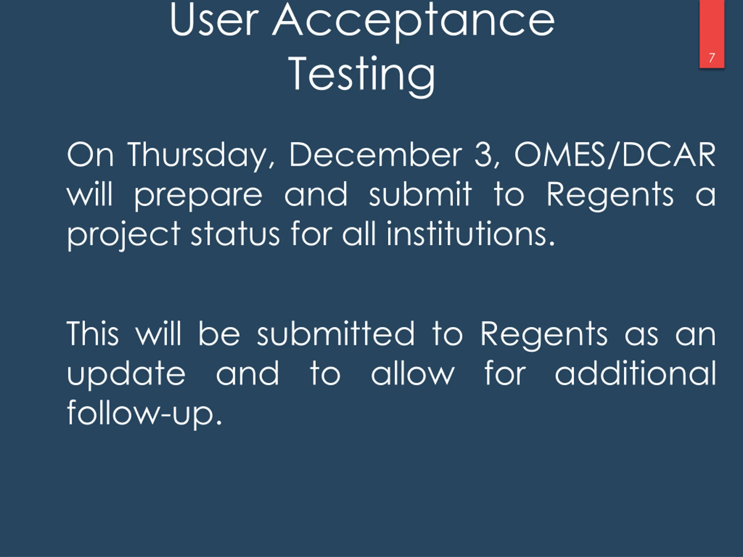 User Acceptance Testing 7 On Thursday, December 3, OMES/DCAR will prepare and submit to Regents a project status for all institutions. This will be submitted to Regents as an update and to allow for additional follow-up.