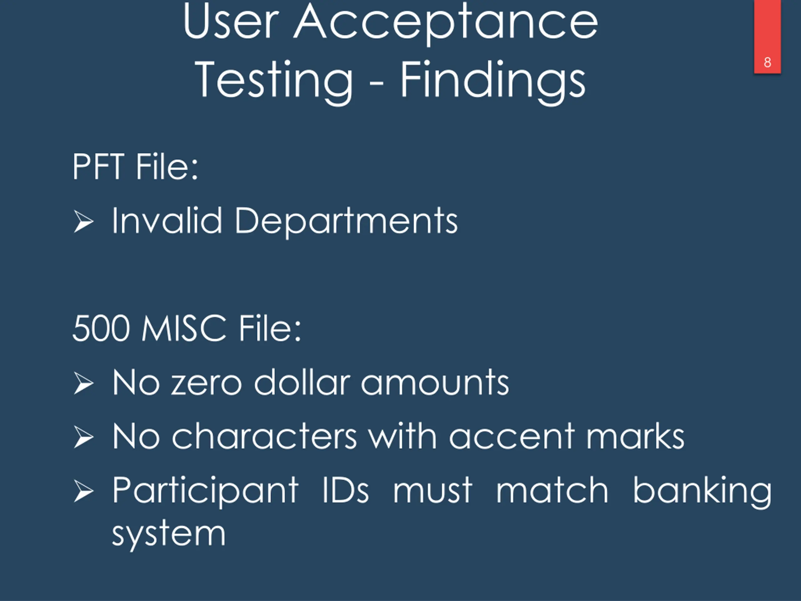 User Acceptance Testing - Findings 8 PFT File: Invalid Departments 500 MISC File: No zero dollar amounts No characters with accent marks Participant IDs must match banking system