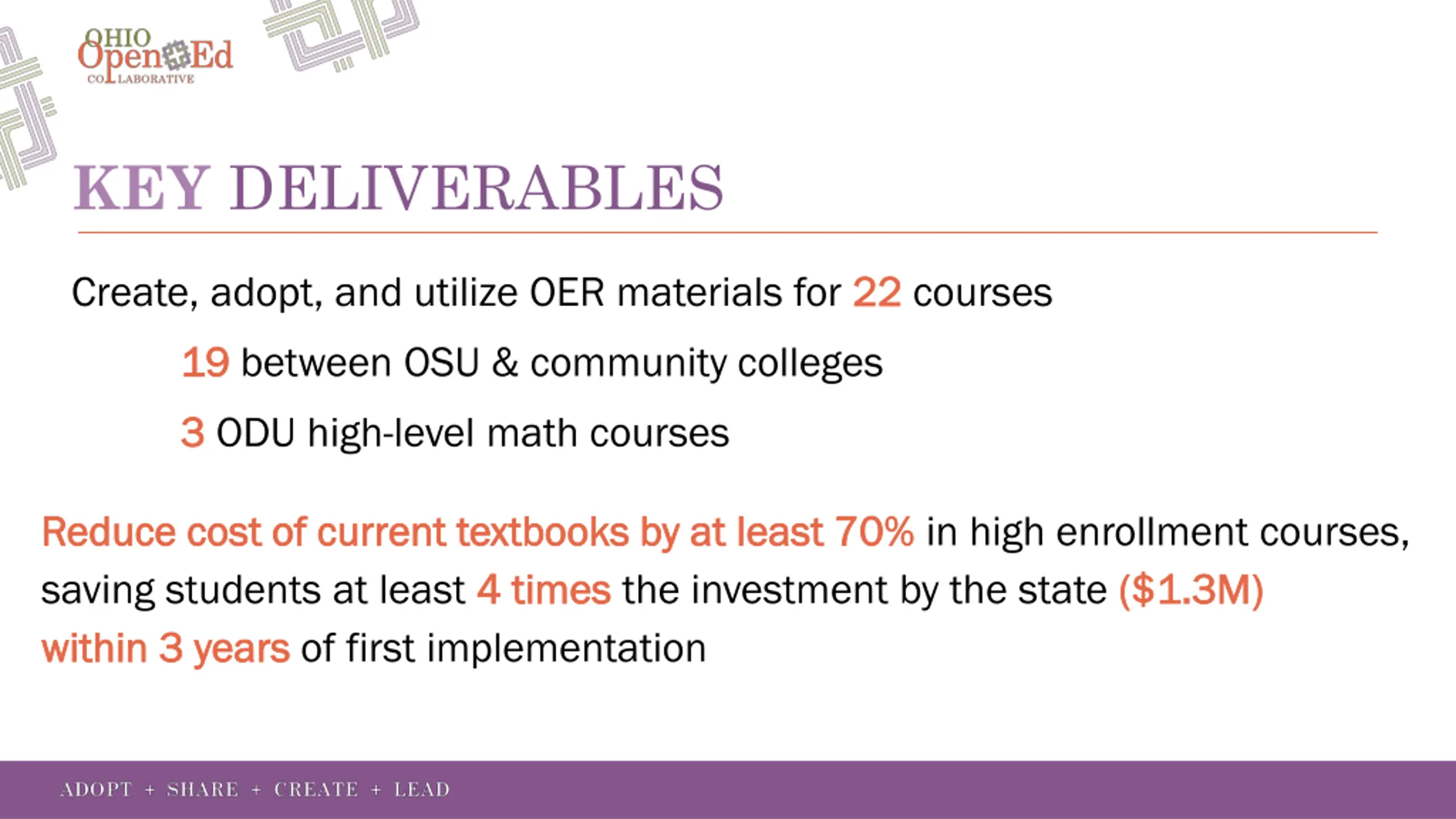KEY DELIVERABLES Create, adopt, and utilize OER materials for 22 22 courses 19 19 between OSU & community colleges 3 3 ODU high-level math courses Reduce cost of current textbooks by at least 70% Reduce cost of current textbooks by at least 70% in high enrollment courses, saving students at least 4 times 4 times the investment by the state ($1.3M within within 3 years 3 years of first implementation ($1.3M) )