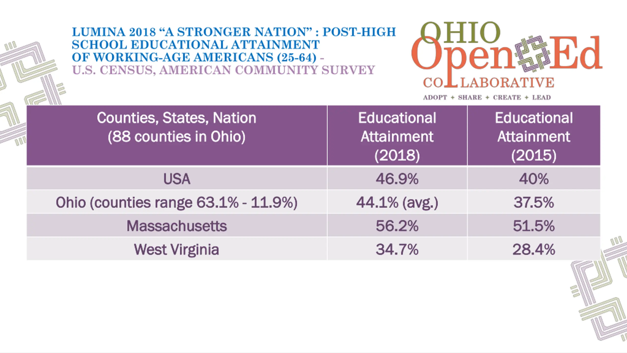 LUMINA 2018 A STRONGER NATION : POST-HIGH SCHOOL EDUCATIONAL ATTAINMENT OF WORKING-AGE AMERICANS (25-64) - U.S. CENSUS, AMERICAN COMMUNITY SURVEY Counties, Counties, States, Nation States, Nation (88 counties in Ohio) (88 counties in Ohio) Educational Educational Attainment Attainment (2018) (2018) 46.9% 46.9% 44.1% (avg.) 44.1% (avg.) 56.2% 56.2% 34.7% 34.7% Educational Educational Attainment Attainment (2015) (2015) 40% 40% 37.5% 37.5% 51.5% 51.5% 28.4% 28.4% USA USA range 63.1% - - 11.9%) Massachusetts Massachusetts West Virginia West Virginia Ohio (counties Ohio (counties range 63.1% 11.9%)