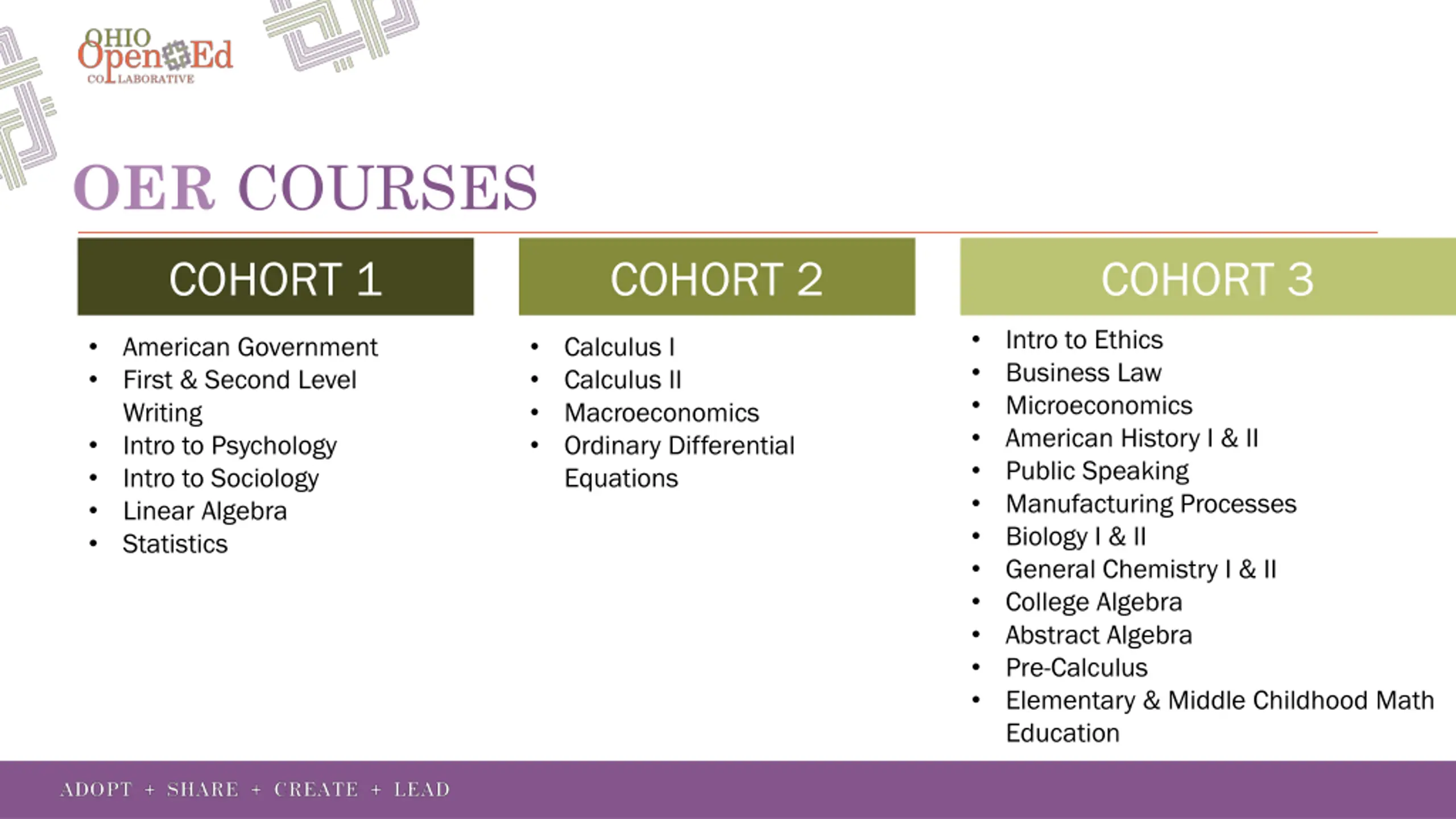 OER COURSES COHORT 1 COHORT 2 COHORT 3 Intro to Ethics Business Law Microeconomics American History I & II Public Speaking Manufacturing Processes Biology I & II General Chemistry I & II College Algebra Abstract Algebra Pre-Calculus Elementary & Middle Childhood Math Education American Government First & Second Level Writing Intro to Psychology Intro to Sociology Linear Algebra Statistics Calculus I Calculus II Macroeconomics Ordinary Differential Equations