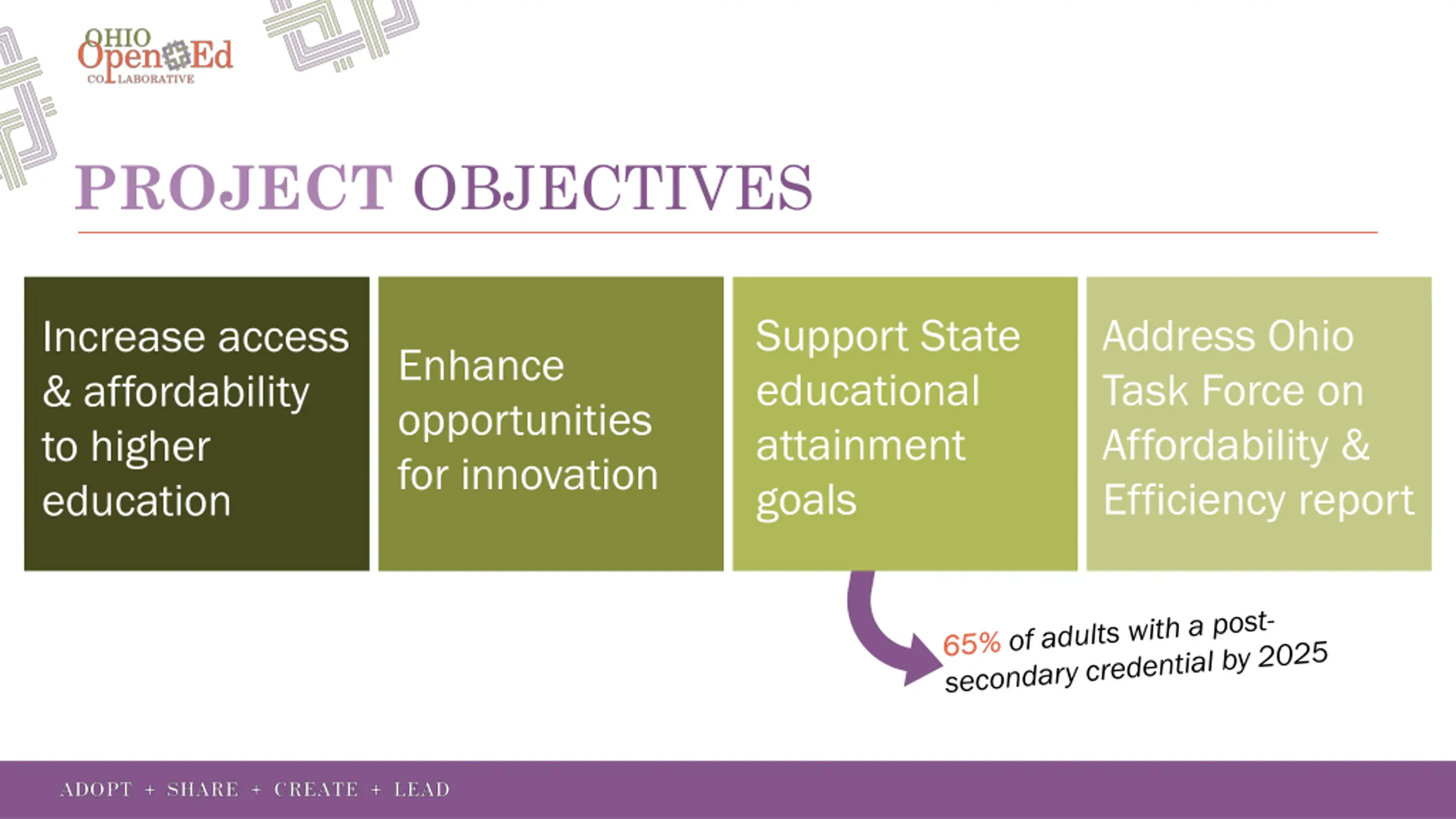 PROJECT OBJECTIVES Support State educational attainment goals Address Ohio Task Force on Affordability & Efficiency report Increase access & affordability to higher education Enhance opportunities for innovation