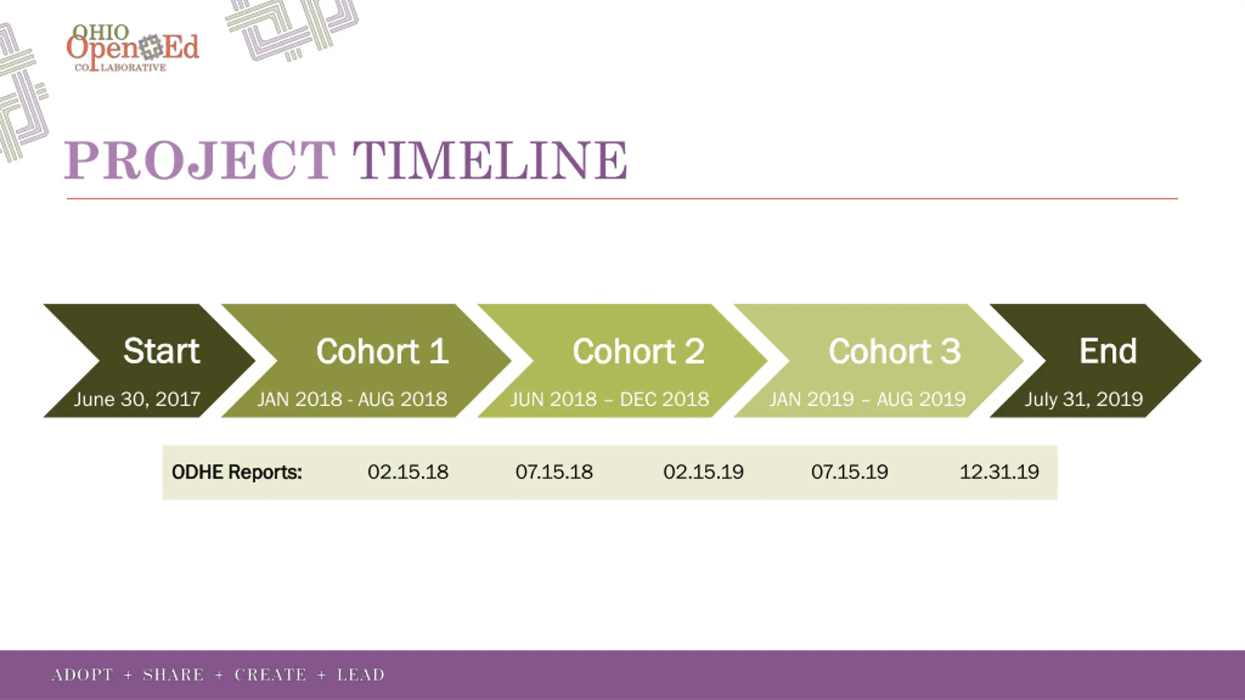 PROJECT TIMELINE Start Start End End Cohort 1 Cohort 1 Cohort 2 Cohort 2 Cohort 3 Cohort 3 June 30, 2017 JAN 2018 - AUG 2018 JUN 2018 DEC 2018 JAN 2019 AUG 2019 July 31, 2019 ODHE Reports: ODHE Reports: 02.15.18 07.15.18 02.15.19 07.15.19 12.31.19
