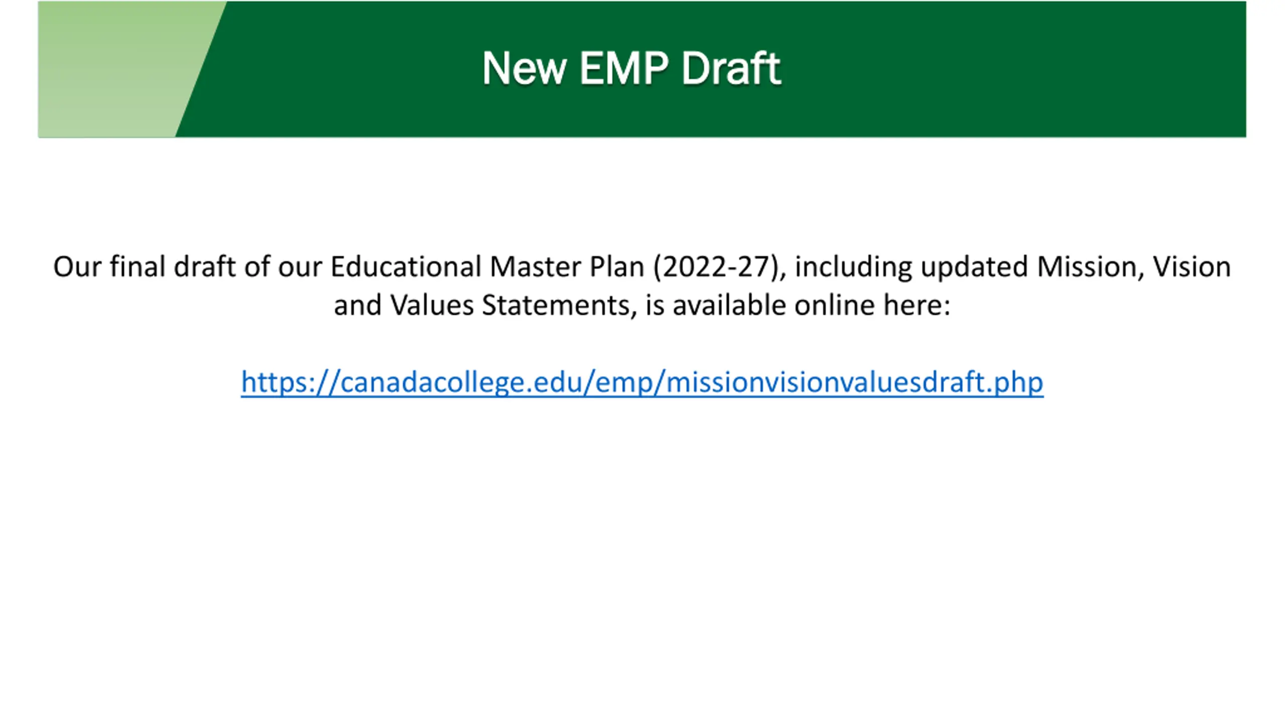 New EMP Draft New EMP Draft Our final draft of our Educational Master Plan (2022-27), including updated Mission, Vision and Values Statements, is available online here: https://canadacollege.edu/emp/missionvisionvaluesdraft.php