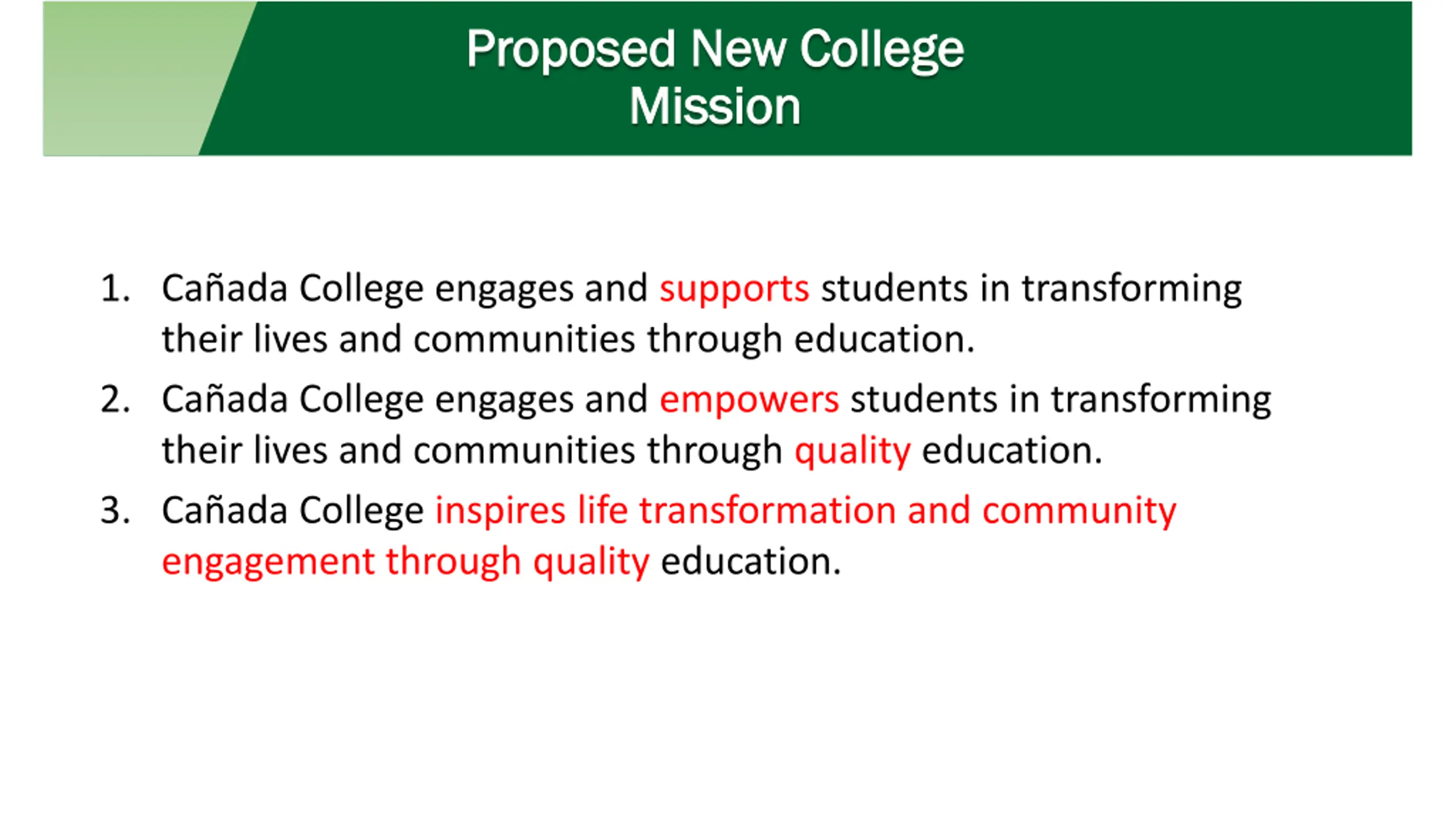 Proposed New College Proposed New College Mission Mission 1. Ca ada College engages and supports students in transforming their lives and communities through education. 2. Ca ada College engages and empowers students in transforming their lives and communities through quality education. 3. Ca ada College inspires life transformation and community engagement through quality education.