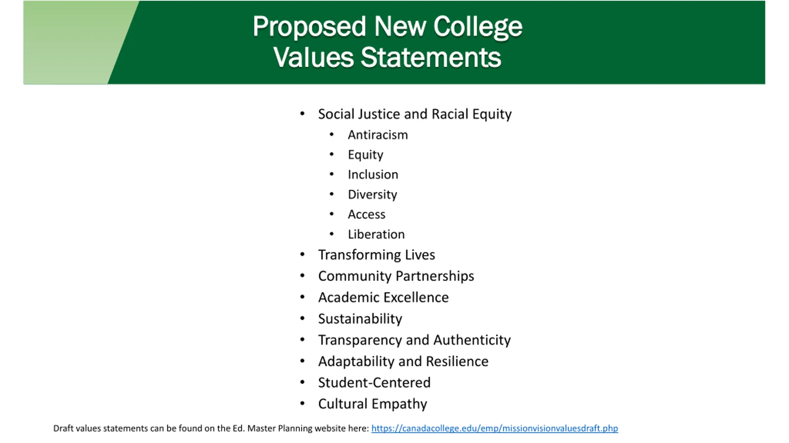 Proposed New College Proposed New College Values Statements Values Statements Social Justice and Racial Equity Antiracism Equity Inclusion Diversity Access Liberation Transforming Lives Community Partnerships Academic Excellence Sustainability Transparency and Authenticity Adaptability and Resilience Student-Centered Cultural Empathy Draft values statements can be found on the Ed. Master Planning website here: https://canadacollege.edu/emp/missionvisionvaluesdraft.php