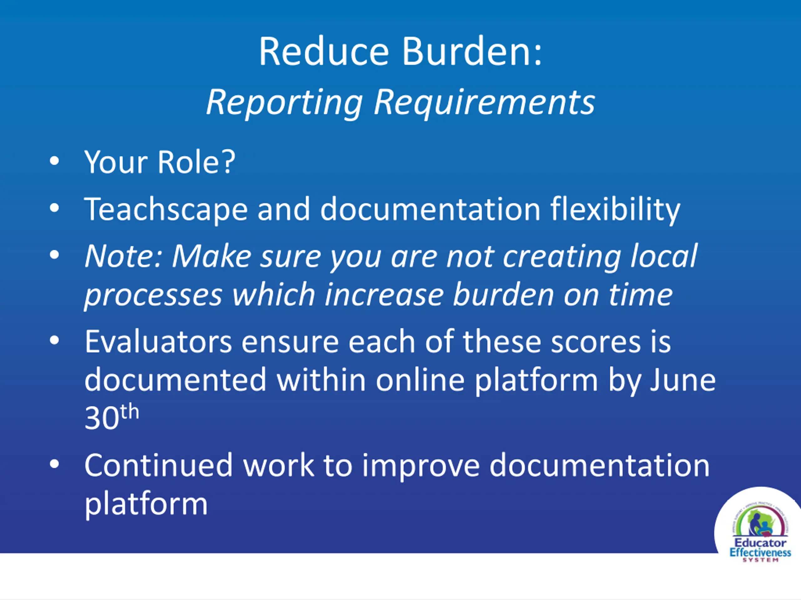 Reduce Burden: Reporting Requirements Your Role? Teachscape and documentation flexibility Note: Make sure you are not creating local processes which increase burden on time Evaluators ensure each of these scores is documented within online platform by June 30th Continued work to improve documentation platform