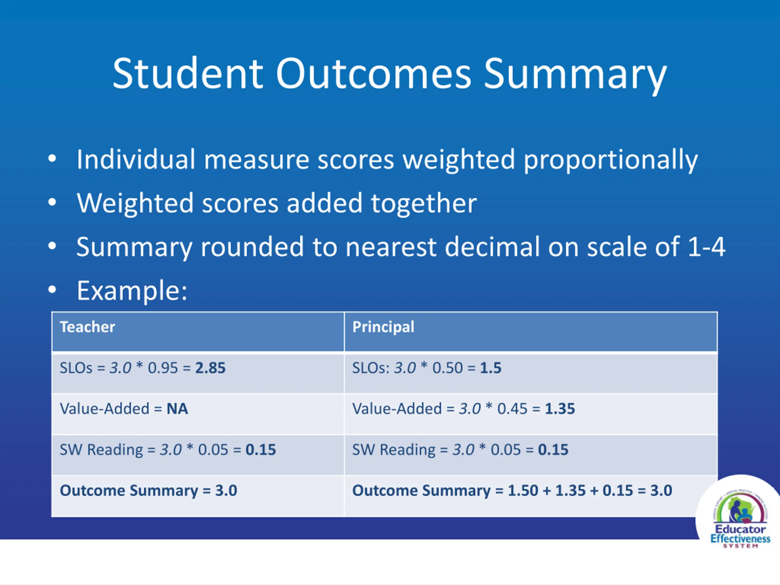 Student Outcomes Summary Individual measure scores weighted proportionally Weighted scores added together Summary rounded to nearest decimal on scale of 1-4 Example: Teacher Principal SLOs = 3.0 * 0.95 = 2.85 SLOs: 3.0 * 0.50 = 1.5 Value-Added = NA Value-Added = 3.0 * 0.45 = 1.35 SW Reading = 3.0 * 0.05 = 0.15 SW Reading = 3.0 * 0.05 = 0.15 Outcome Summary = 3.0 Outcome Summary = 1.50 + 1.35 + 0.15 = 3.0