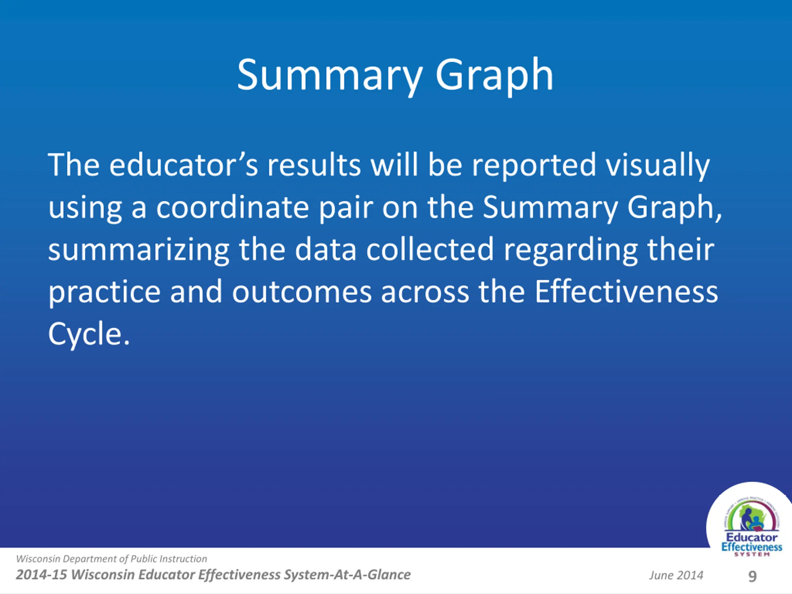 Summary Graph The educator s results will be reported visually using a coordinate pair on the Summary Graph, summarizing the data collected regarding their practice and outcomes across the Effectiveness Cycle. Wisconsin Department of Public Instruction 2014-15Wisconsin Educator Effectiveness System-At-A-GlanceJune 2014 9