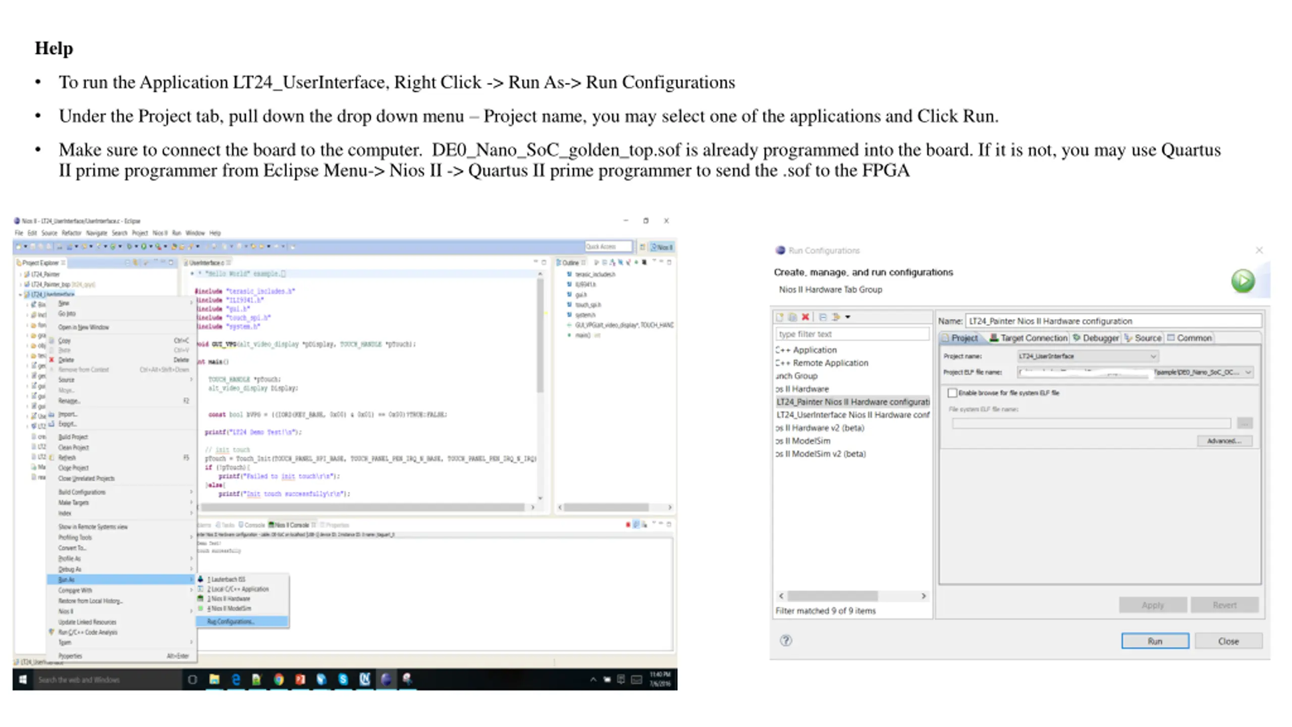 Help To run the Application LT24_UserInterface, Right Click -> Run As-> Run Configurations Under the Project tab, pull down the drop down menu Project name, you may select one of the applications and Click Run. Make sure to connect the board to the computer. DE0_Nano_SoC_golden_top.sof is already programmed into the board. If it is not, you may use Quartus II prime programmer from Eclipse Menu-> Nios II -> Quartus II prime programmer to send the .sof to the FPGA