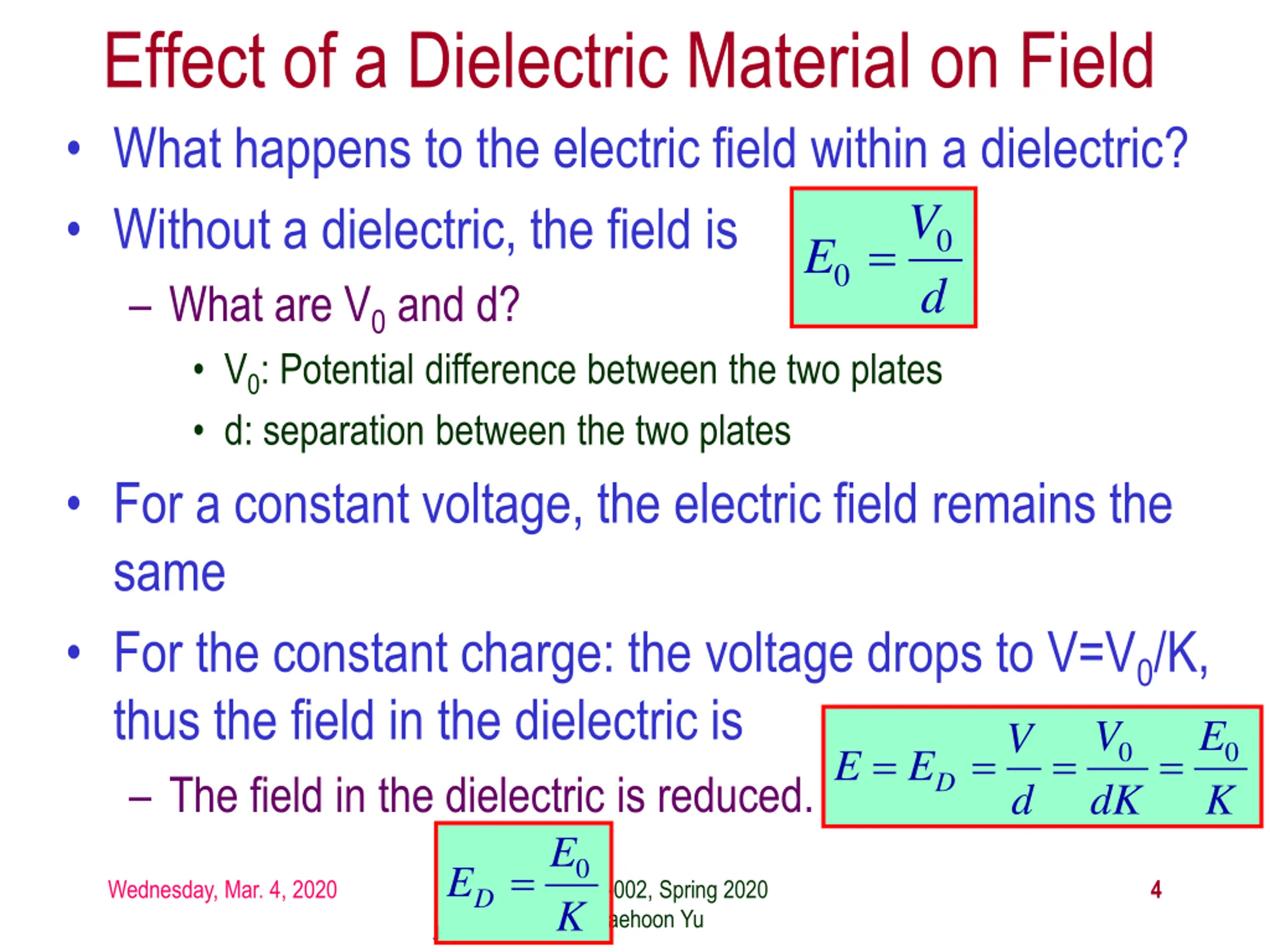 Effect of a Dielectric Material on Capacitance Let s consider the two cases below: Case #1 : constant V Case #2 : constant Q Constant voltage: Experimentally observed that the total charge on each plate of the capacitor increases by K as a dielectric material is inserted between the gap Q=KQ0 The capacitance increased to C=Q/V0=KQ0/V0=KC0 Constant charge: Voltage found to drop by a factor K V=V0/K The capacitance increased to C=Q0/V=KQ0/V0=KC0 Wednesday, Mar. 4, 2020 PHYS 1444-002, Spring 2020 Dr. Jaehoon Yu 3