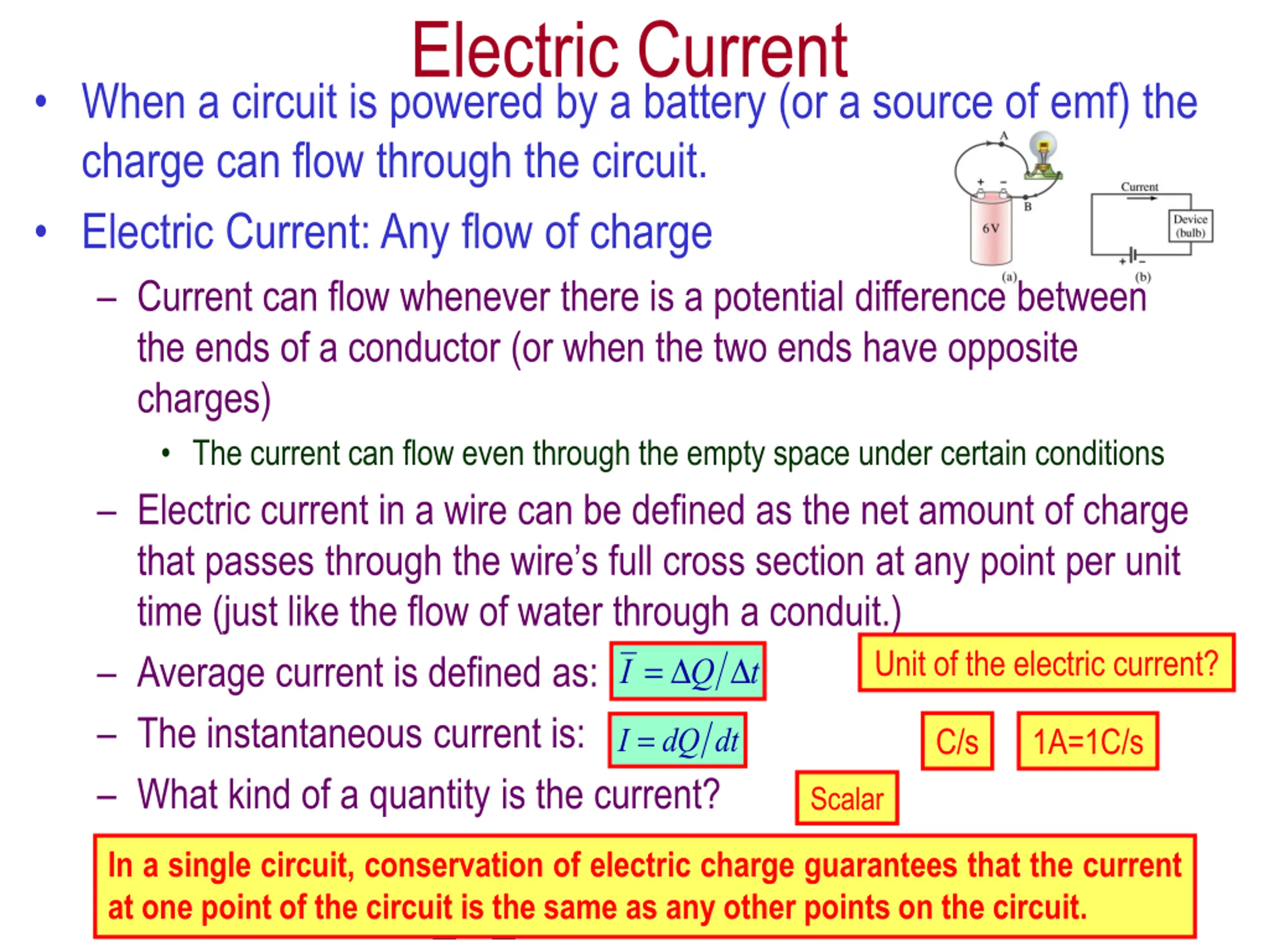 Electric Current When a circuit is powered by a battery (or a source of emf) the charge can flow through the circuit. Electric Current: Any flow of charge Current can flow whenever there is a potential difference between the ends of a conductor (or when the two ends have opposite charges) The current can flow even through the empty space under certain conditions Electric current in a wire can be defined as the net amount of charge that passes through the wire s full cross section at any point per unit time (just like the flow of water through a conduit.) Average current is defined as: The instantaneous current is: What kind of a quantity is the current? Unit of the electric current? I = DQ Dt I = dQ dt C/s 1A=1C/s Scalar In a single circuit, conservation of electric charge guarantees that the current Wednesday, Mar. 4, 2020 at one point of the circuit is the same as any other points on the circuit. PHYS 1444-002, Spring 2020 Dr. Jaehoon Yu 13