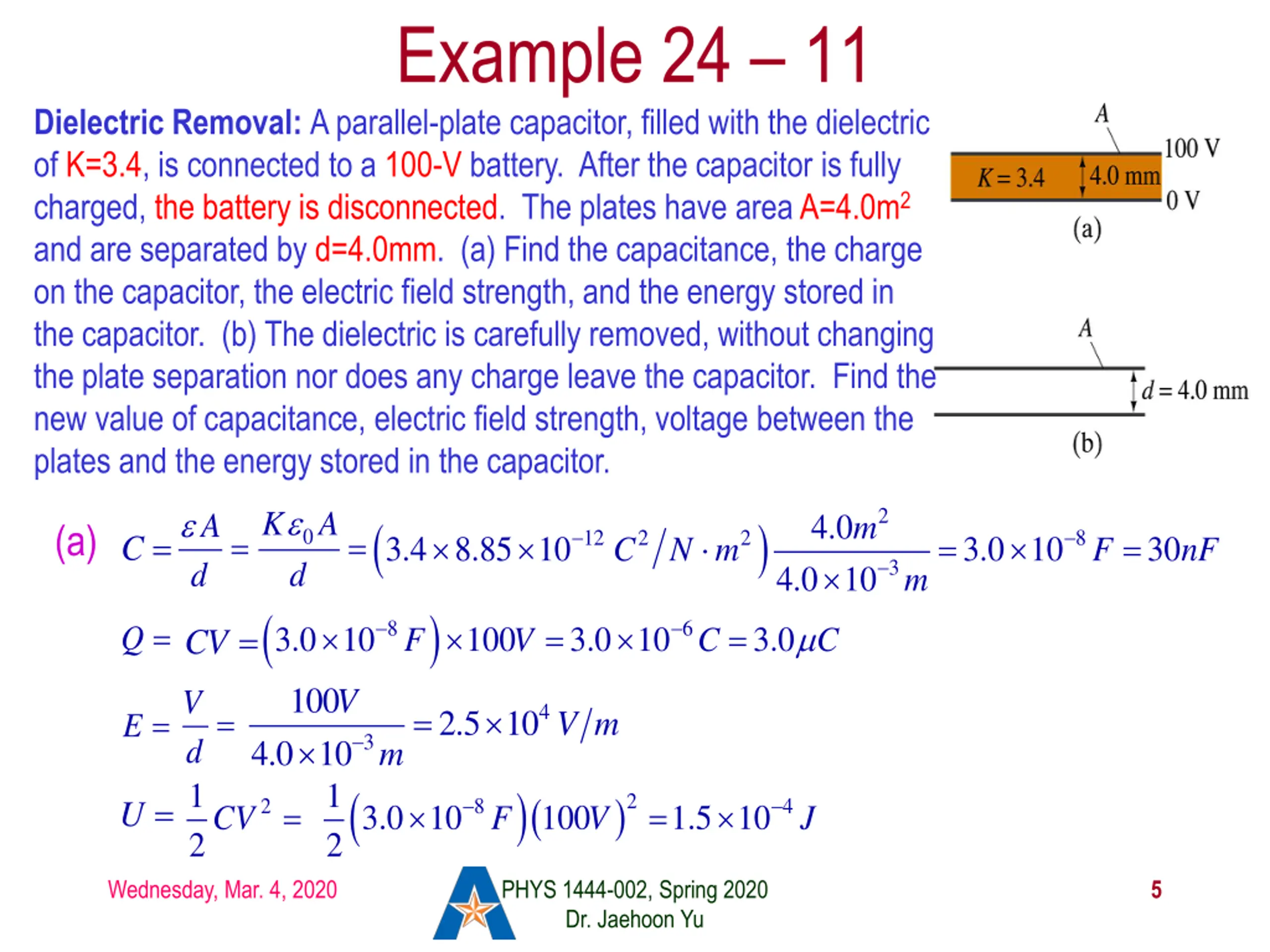 Example 24 11 Dielectric Removal: A parallel-plate capacitor, filled with the dielectric of K=3.4, is connected to a 100-V battery. After the capacitor is fully charged, the battery is disconnected. The plates have area A=4.0m2 and are separated by d=4.0mm. (a) Find the capacitance, the charge on the capacitor, the electric field strength, and the energy stored in the capacitor. (b) The dielectric is carefully removed, without changing the plate separation nor does any charge leave the capacitor. Find the new value of capacitance, electric field strength, voltage between the plates and the energy stored in the capacitor. 2 K A A =( ) 4.0 m (a) C = 0 = 12 2 2 8 3.4 8.85 10 N m = 3.0 10 = 30 C F nF 3 d d CV =( V d 1 2CV = 4.0 10 m ) Q = 8 6 3.0 10 = 3.0 10 = 100 3.0 F V C C 100 V 4 = 2.5 10 = E = V m ( 3 4.0 10 m )( 13.0 10 2 ) 2 U = 2 8 4 = 1.5 10 100 F V J Wednesday, Mar. 4, 2020 PHYS 1444-002, Spring 2020 Dr. Jaehoon Yu 5