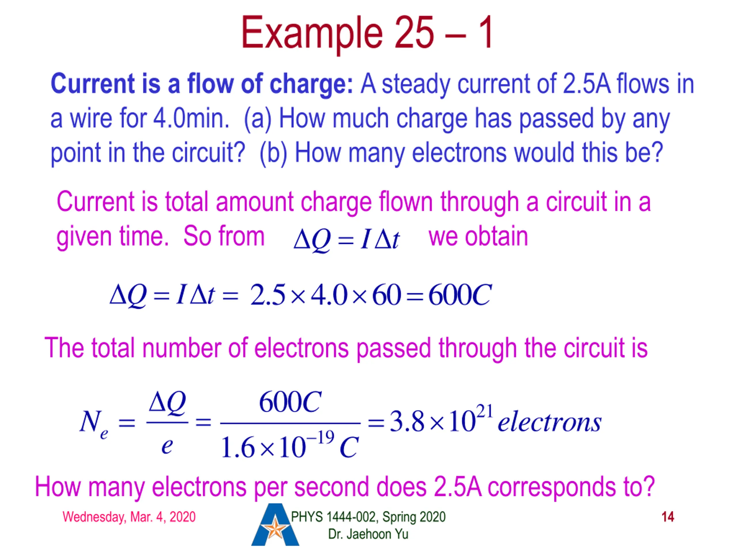 Example 25 1 Current is a flow of charge: A steady current of 2.5A flows in a wire for 4.0min. (a) How much charge has passed by any point in the circuit? (b) How many electrons would this be? Current is total amount charge flown through a circuit in a given time. So from we obtain Q = I t 2.5 4.0 60 600C = = = Q I t The total number of electrons passed through the circuit is 600 Q e C 21 = N = = 3.8 10 electrons e 19 1.6 10 C How many electrons per second does 2.5A corresponds to? Wednesday, Mar. 4, 2020 PHYS 1444-002, Spring 2020 Dr. Jaehoon Yu 14