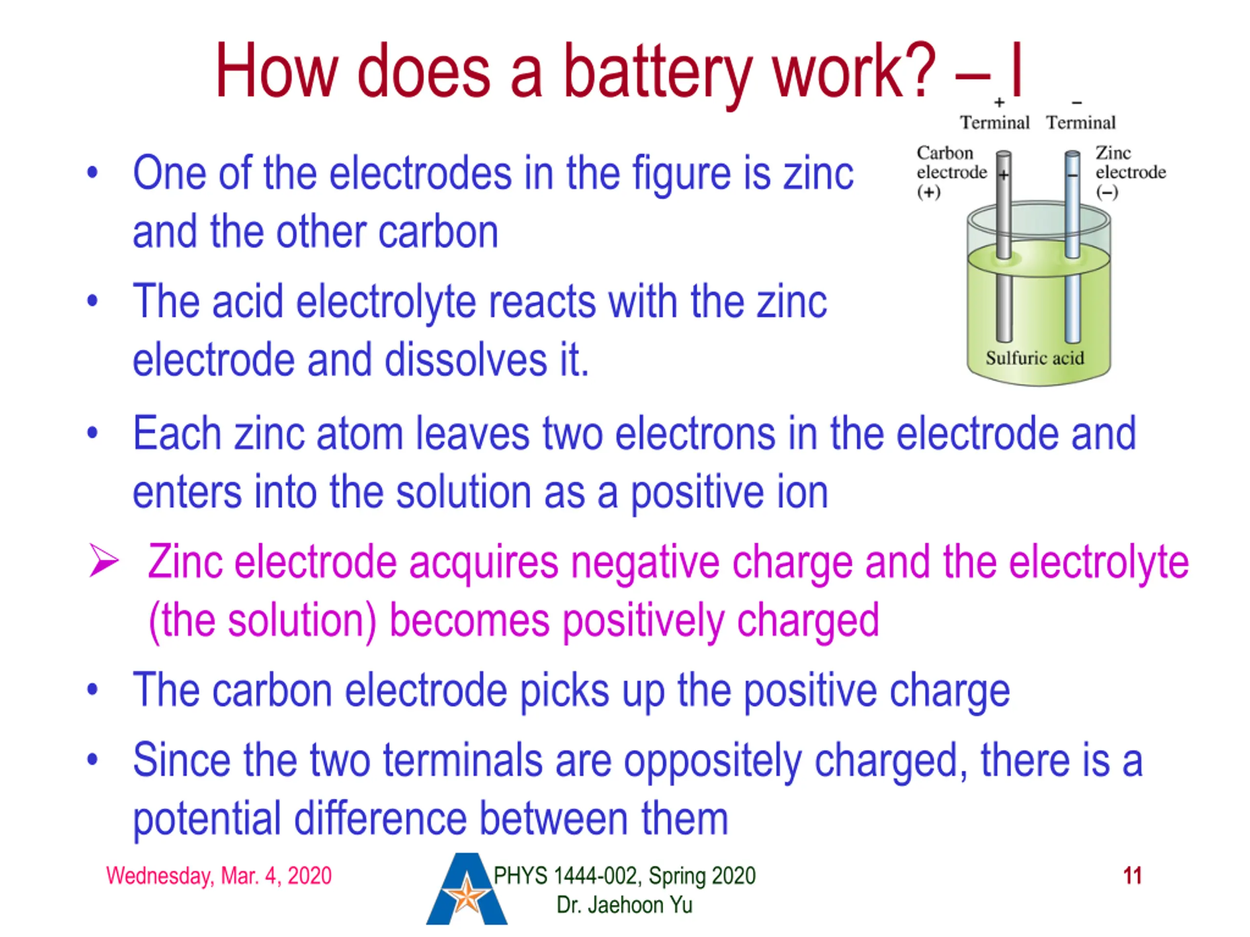 How does a battery work? I One of the electrodes in the figure is zinc and the other carbon The acid electrolyte reacts with the zinc electrode and dissolves it. Each zinc atom leaves two electrons in the electrode and enters into the solution as a positive ion Zinc electrode acquires negative charge and the electrolyte (the solution) becomes positively charged The carbon electrode picks up the positive charge Since the two terminals are oppositely charged, there is a potential difference between them Wednesday, Mar. 4, 2020 PHYS 1444-002, Spring 2020 Dr. Jaehoon Yu 11