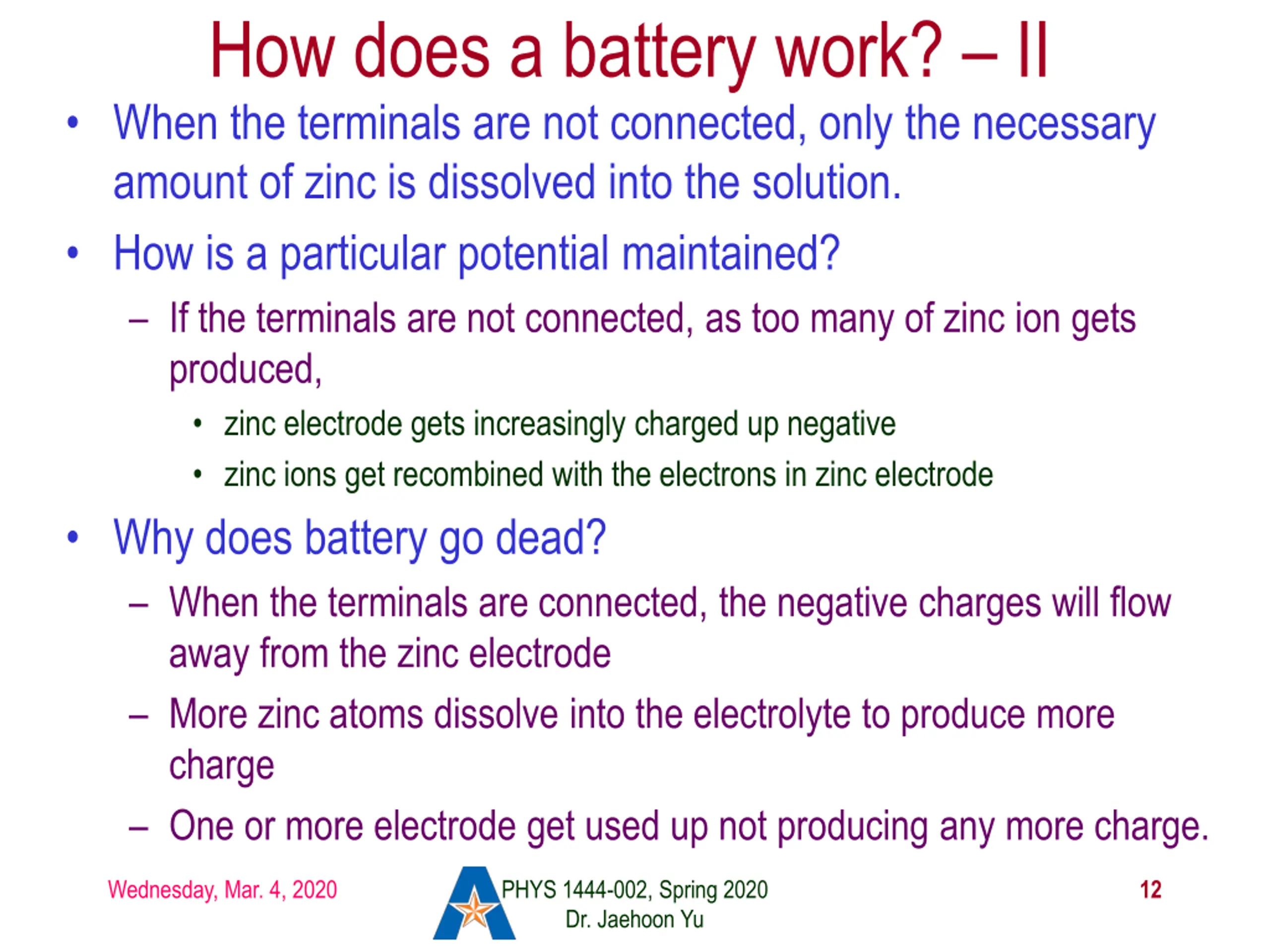 How does a battery work? II When the terminals are not connected, only the necessary amount of zinc is dissolved into the solution. How is a particular potential maintained? If the terminals are not connected, as too many of zinc ion gets produced, zinc electrode gets increasingly charged up negative zinc ions get recombined with the electrons in zinc electrode Why does battery go dead? When the terminals are connected, the negative charges will flow away from the zinc electrode More zinc atoms dissolve into the electrolyte to produce more charge One or more electrode get used up not producing any more charge. Wednesday, Mar. 4, 2020 PHYS 1444-002, Spring 2020 Dr. Jaehoon Yu 12