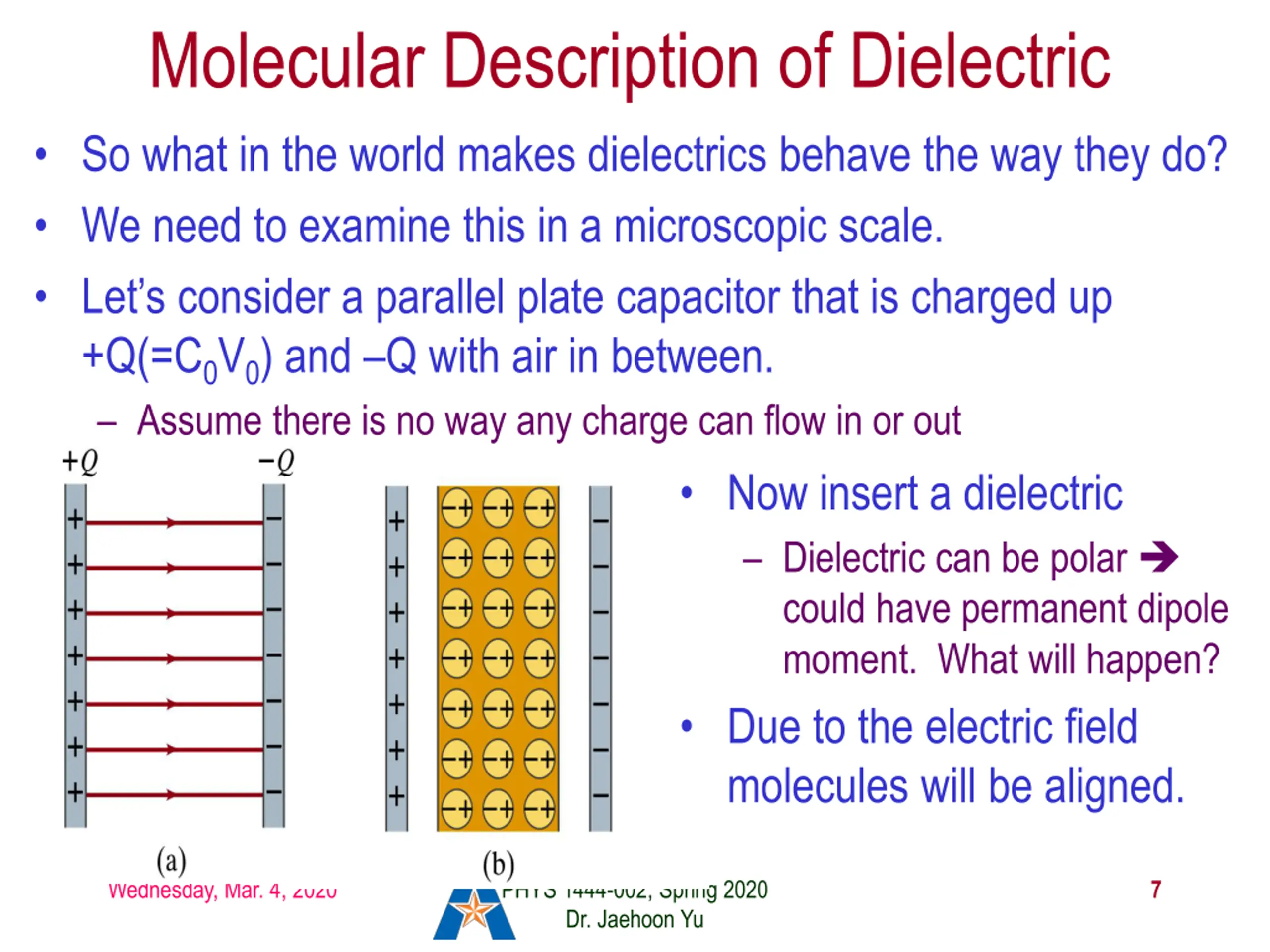 Molecular Description of Dielectric So what in the world makes dielectrics behave the way they do? We need to examine this in a microscopic scale. Let s consider a parallel plate capacitor that is charged up +Q(=C0V0) and Q with air in between. Assume there is no way any charge can flow in or out Now insert a dielectric Dielectric can be polar could have permanent dipole moment. What will happen? Due to the electric field molecules will be aligned. Wednesday, Mar. 4, 2020 PHYS 1444-002, Spring 2020 Dr. Jaehoon Yu 7