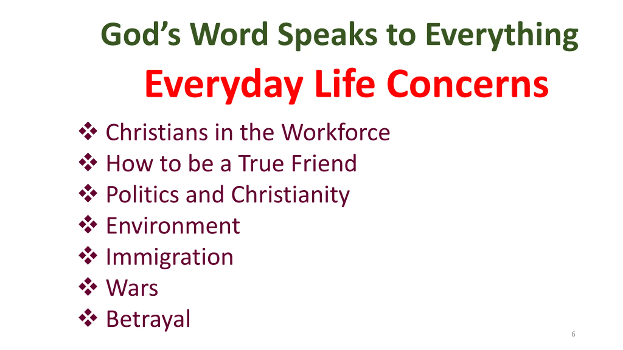 Gods Word Speaks to Everything Everyday Life Concerns Christians in the Workforce How to be a True Friend Politics and Christianity Environment Immigration Wars Betrayal 6