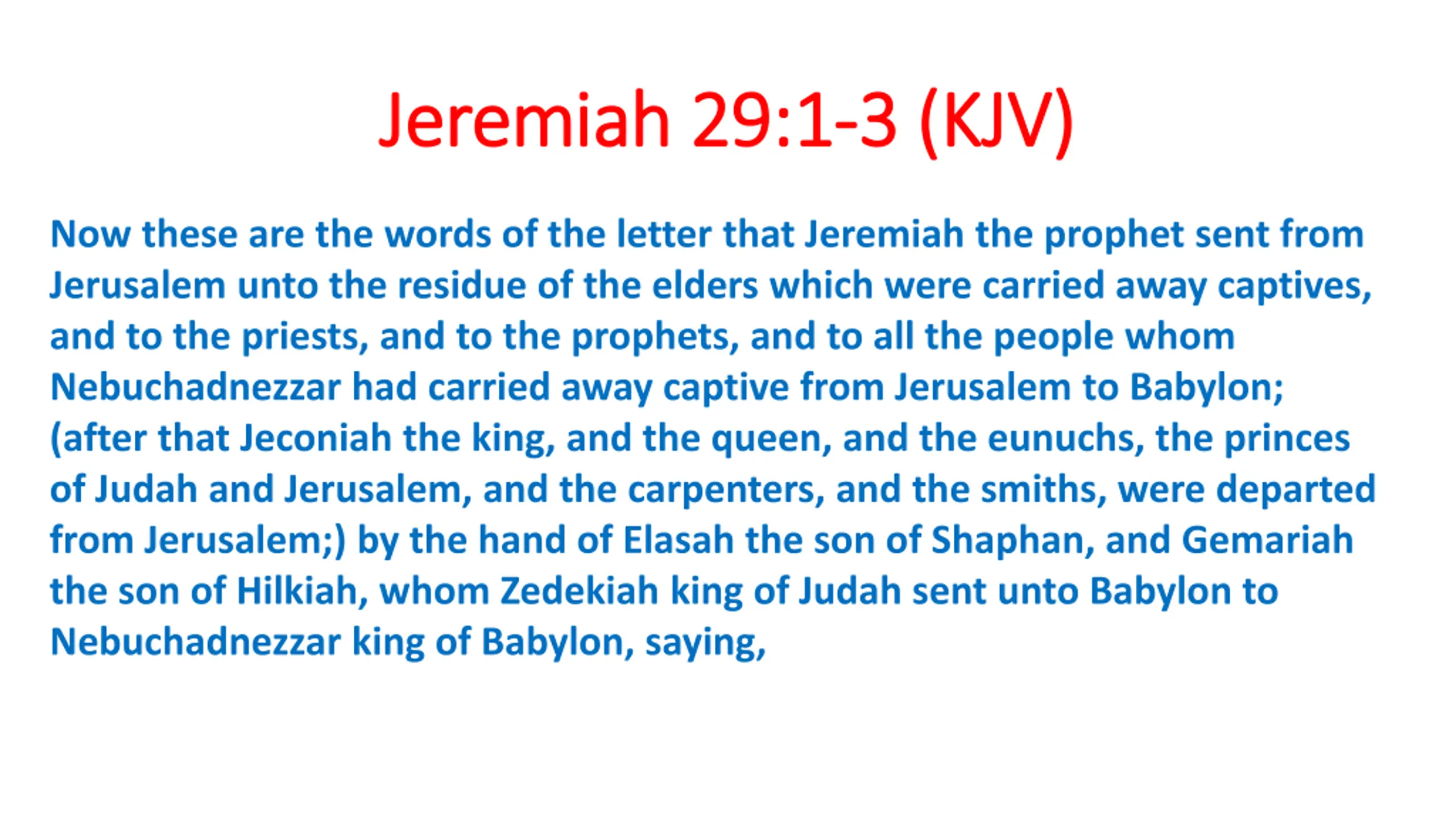 Jeremiah 29:1 Jeremiah 29:1- -3 (KJV) 3 (KJV) Now these are the words of the letter that Jeremiah the prophet sent from Jerusalem unto the residue of the elders which were carried away captives, and to the priests, and to the prophets, and to all the people whom Nebuchadnezzar had carried away captive from Jerusalem to Babylon; (after that Jeconiah the king, and the queen, and the eunuchs, the princes of Judah and Jerusalem, and the carpenters, and the smiths, were departed from Jerusalem;) by the hand of Elasah the son of Shaphan, and Gemariah the son of Hilkiah, whom Zedekiah king of Judah sent unto Babylon to Nebuchadnezzar king of Babylon, saying,