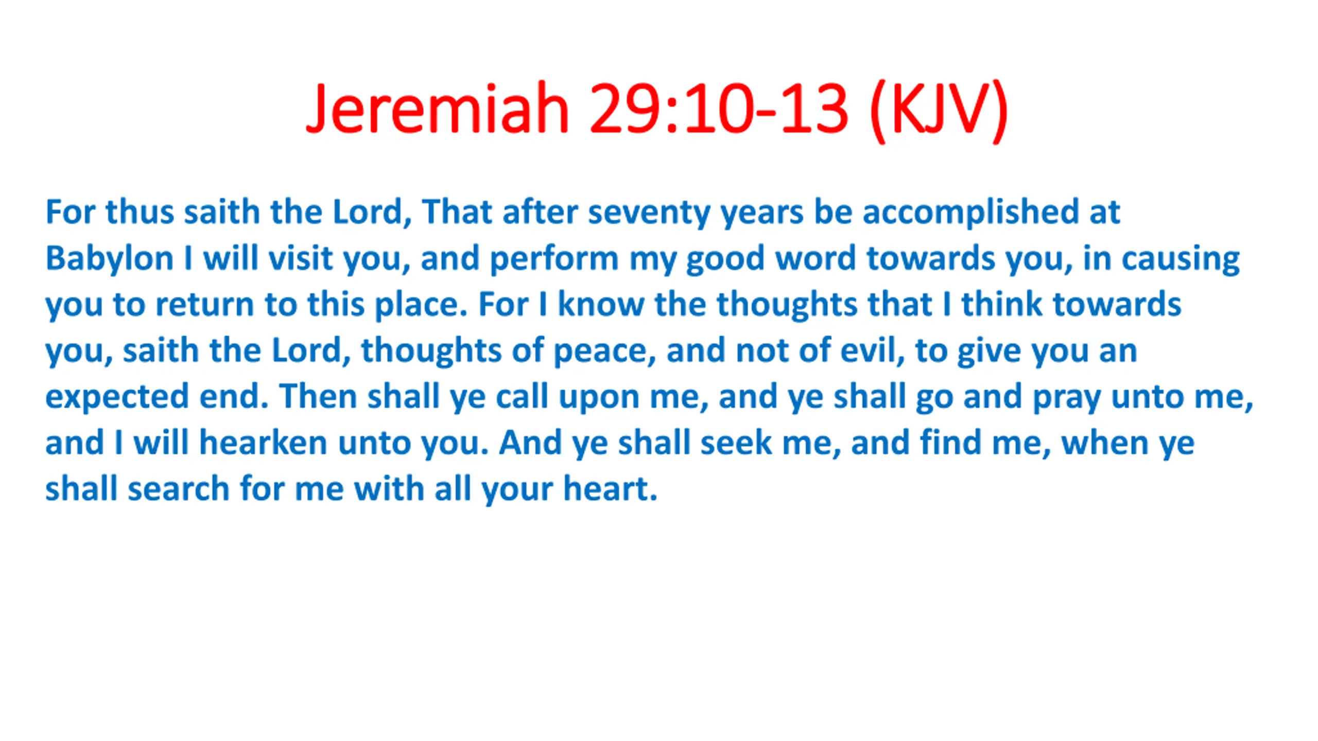 Jeremiah 29:10 Jeremiah 29:10- -13 (KJV) 13 (KJV) For thus saith the Lord, That after seventy years be accomplished at Babylon I will visit you, and perform my good word towards you, in causing you to return to this place. For I know the thoughts that I think towards you, saith the Lord, thoughts of peace, and not of evil, to give you an expected end. Then shall ye call upon me, and ye shall go and pray unto me, and I will hearken unto you. And ye shall seek me, and find me, when ye shall search for me with all your heart.