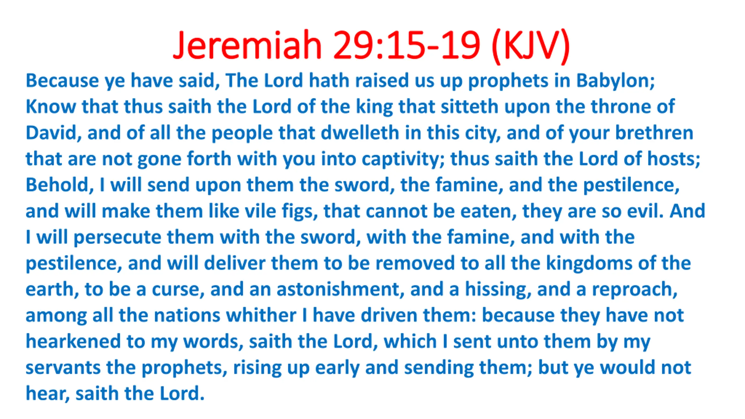 Jeremiah 29:15 Jeremiah 29:15- -19 (KJV) Because ye have said, The Lord hath raised us up prophets in Babylon; Know that thus saith the Lord of the king that sitteth upon the throne of David, and of all the people that dwelleth in this city, and of your brethren that are not gone forth with you into captivity; thus saith the Lord of hosts; Behold, I will send upon them the sword, the famine, and the pestilence, and will make them like vile figs, that cannot be eaten, they are so evil. And I will persecute them with the sword, with the famine, and with the pestilence, and will deliver them to be removed to all the kingdoms of the earth, to be a curse, and an astonishment, and a hissing, and a reproach, among all the nations whither I have driven them: because they have not hearkened to my words, saith the Lord, which I sent unto them by my servants the prophets, rising up early and sending them; but ye would not hear, saith the Lord. 19 (KJV)