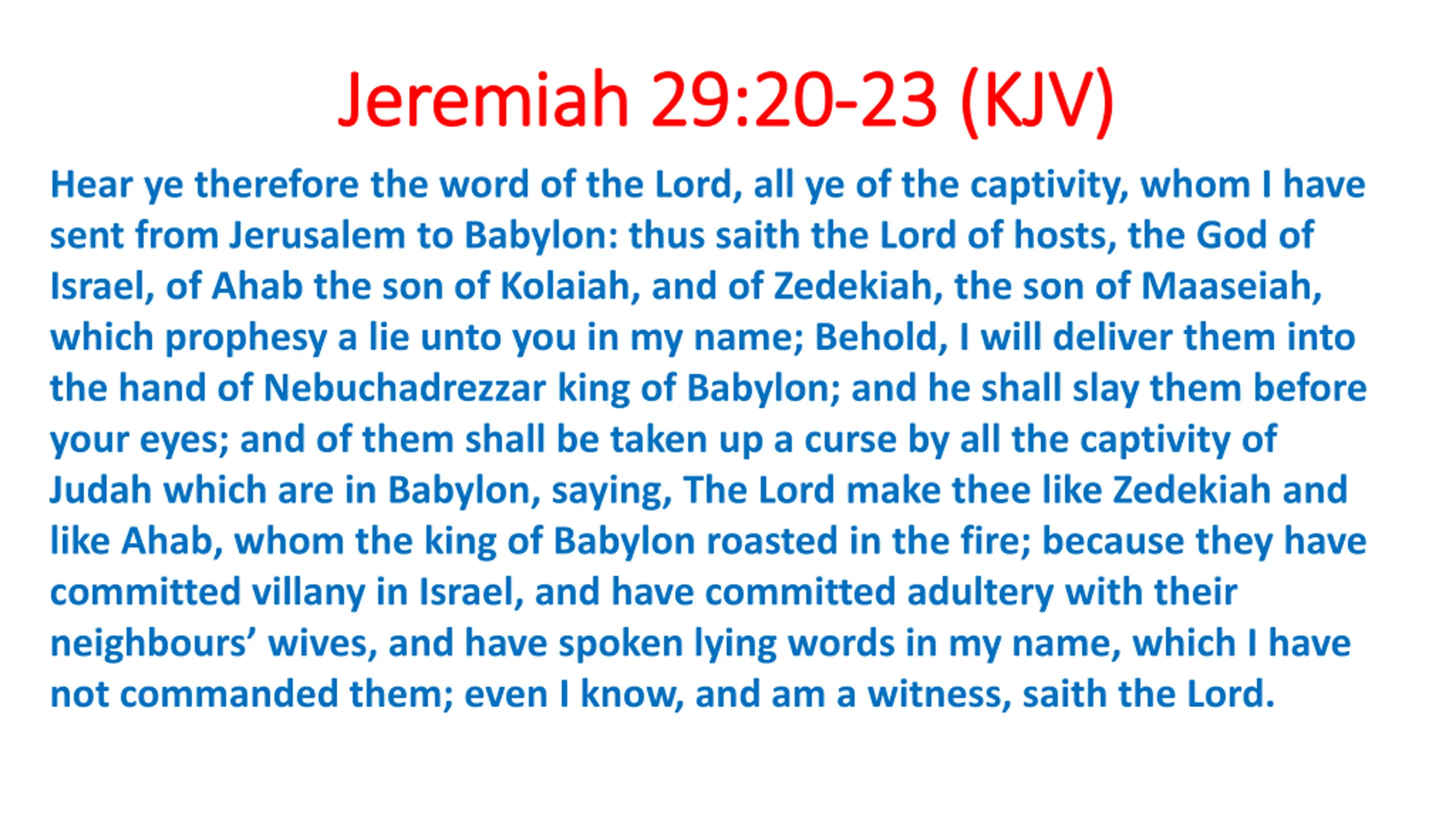 Jeremiah 29:20 Jeremiah 29:20- -23 (KJV) Hear ye therefore the word of the Lord, all ye of the captivity, whom I have sent from Jerusalem to Babylon: thus saith the Lord of hosts, the God of Israel, of Ahab the son of Kolaiah, and of Zedekiah, the son of Maaseiah, which prophesy a lie unto you in my name; Behold, I will deliver them into the hand of Nebuchadrezzar king of Babylon; and he shall slay them before your eyes; and of them shall be taken up a curse by all the captivity of Judah which are in Babylon, saying, The Lord make thee like Zedekiah and like Ahab, whom the king of Babylon roasted in the fire; because they have committed villany in Israel, and have committed adultery with their neighbours wives, and have spoken lying words in my name, which I have not commanded them; even I know, and am a witness, saith the Lord. 23 (KJV)