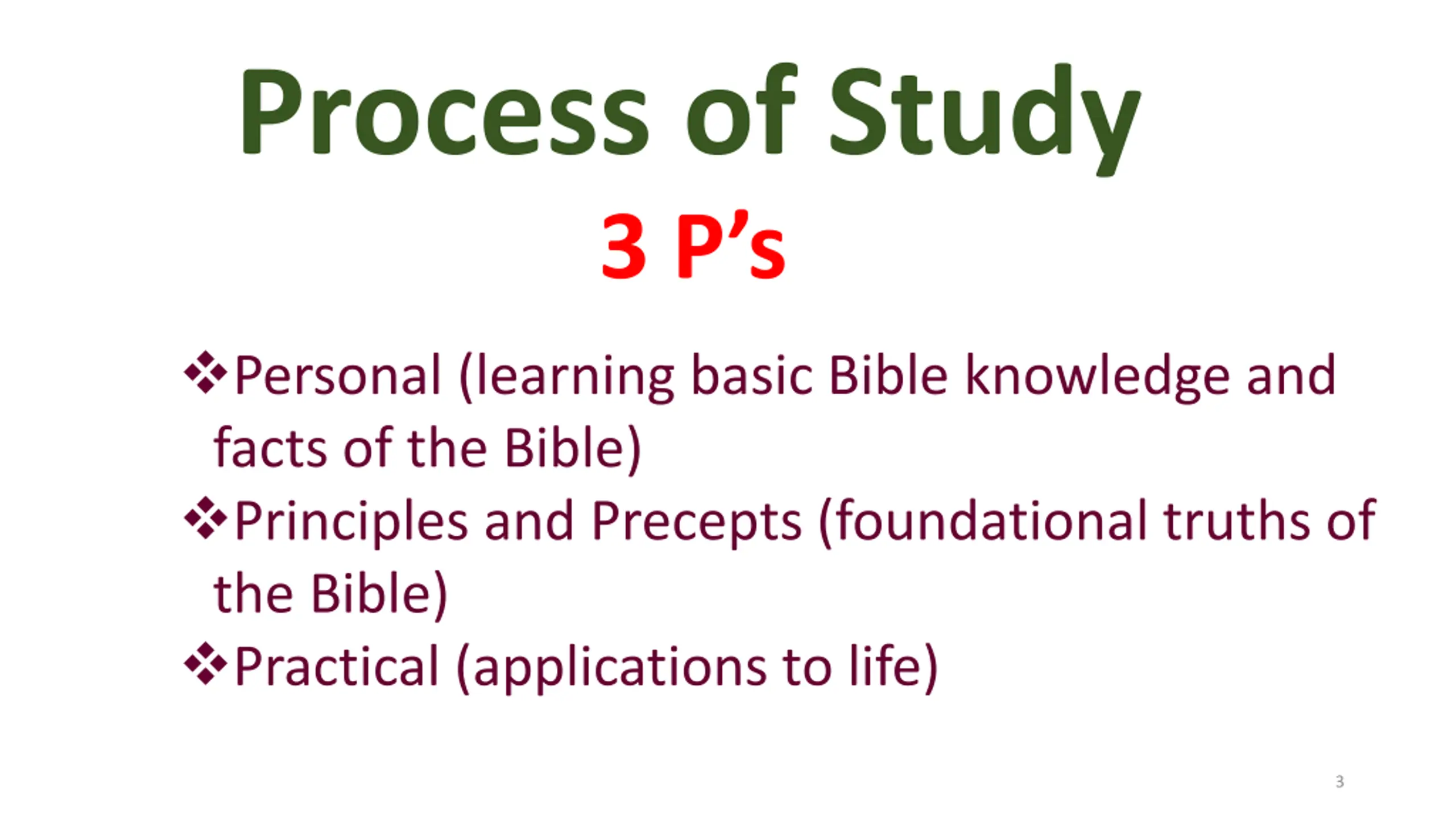 Process of Study 3 P s Personal (learning basic Bible knowledge and facts of the Bible) Principles and Precepts (foundational truths of the Bible) Practical (applications to life) 3