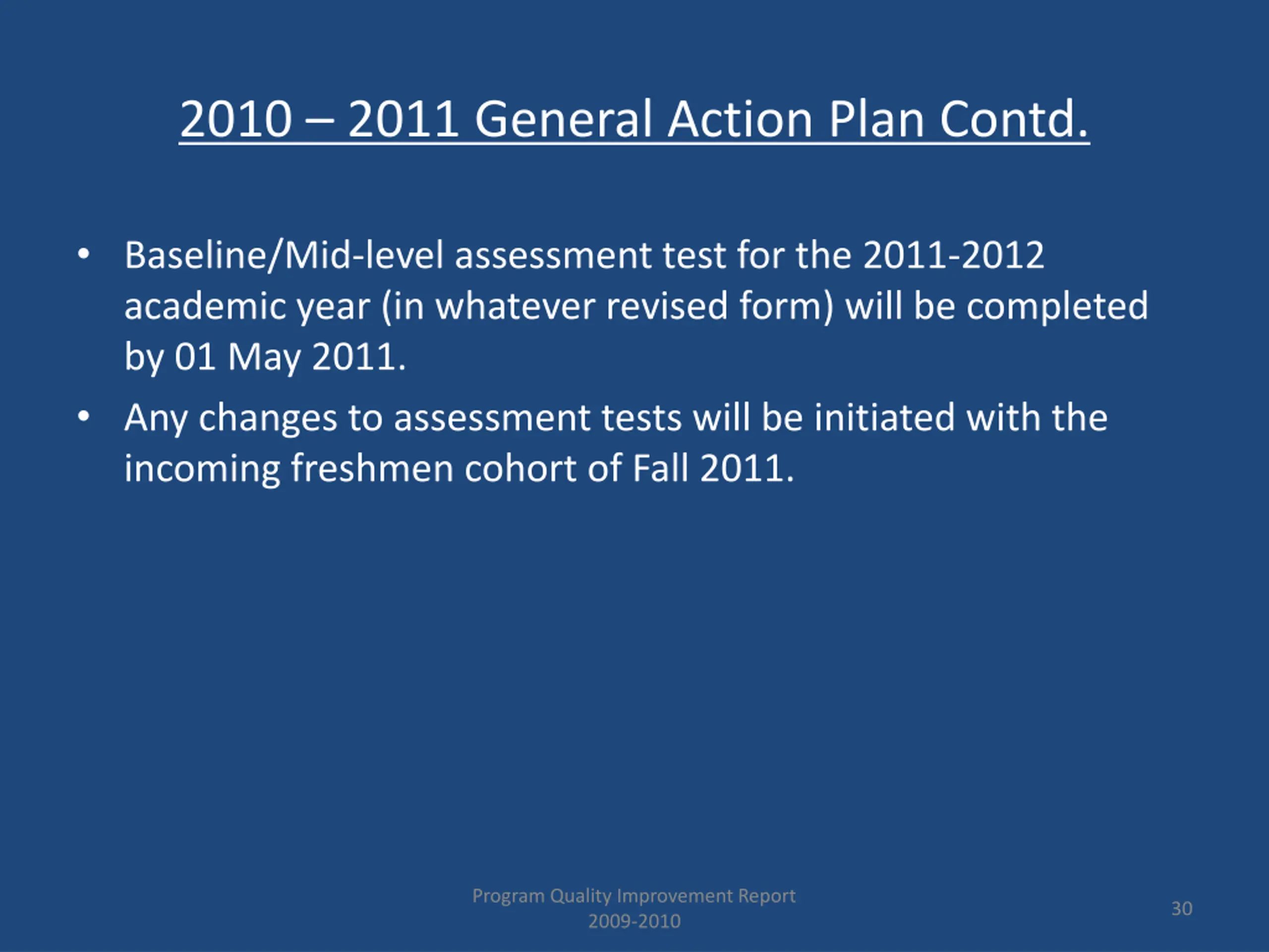 2010 2011 General Action Plan Contd. Baseline/Mid-level assessment test for the 2011-2012 academic year (in whatever revised form) will be completed by 01 May 2011. Any changes to assessment tests will be initiated with the incoming freshmen cohort of Fall 2011. Program Quality Improvement Report 2009-2010 30