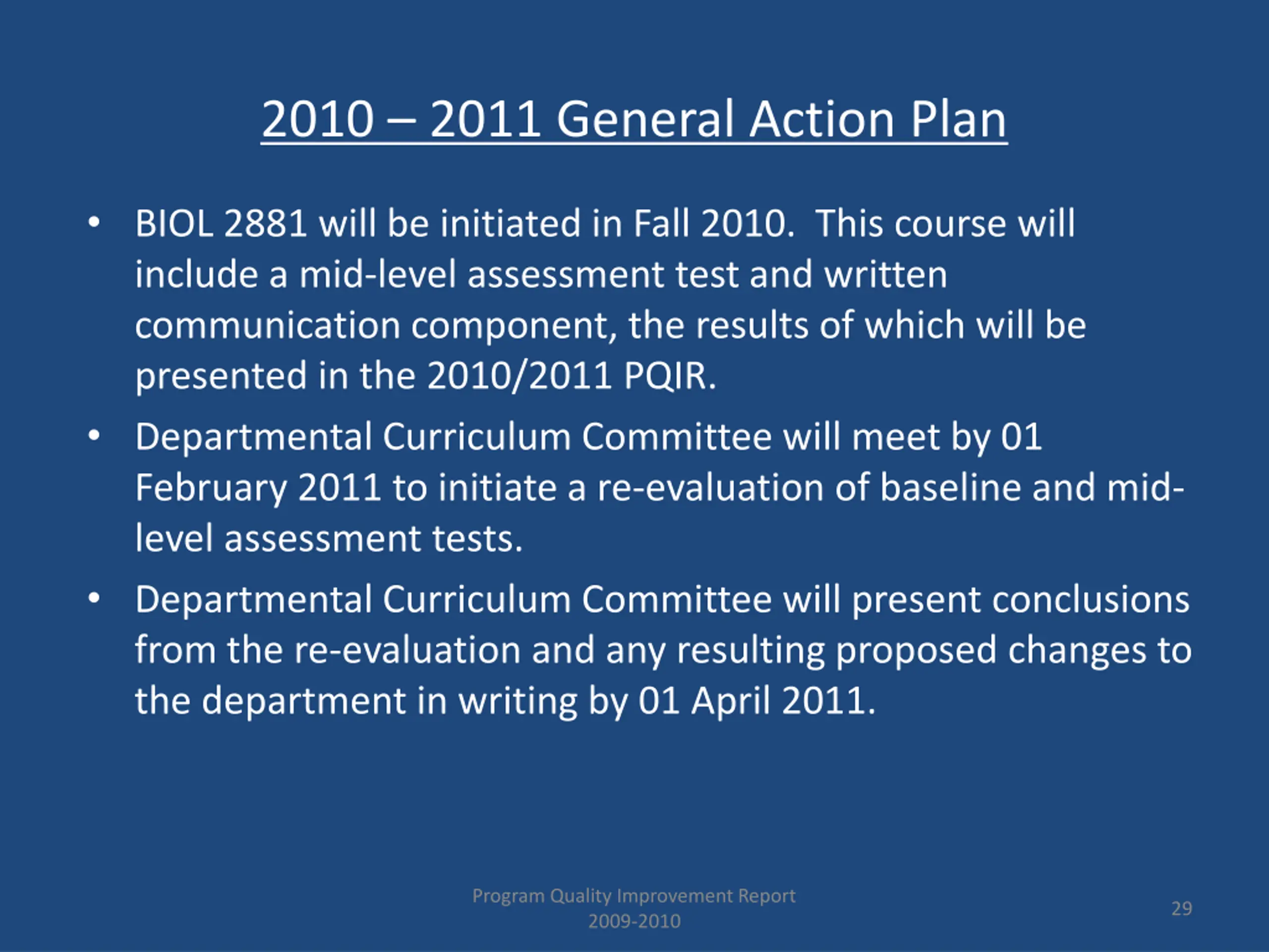 2010 2011 General Action Plan BIOL 2881 will be initiated in Fall 2010. This course will include a mid-level assessment test and written communication component, the results of which will be presented in the 2010/2011 PQIR. Departmental Curriculum Committee will meet by 01 February 2011 to initiate a re-evaluation of baseline and mid- level assessment tests. Departmental Curriculum Committee will present conclusions from the re-evaluation and any resulting proposed changes to the department in writing by 01 April 2011. Program Quality Improvement Report 2009-2010 29