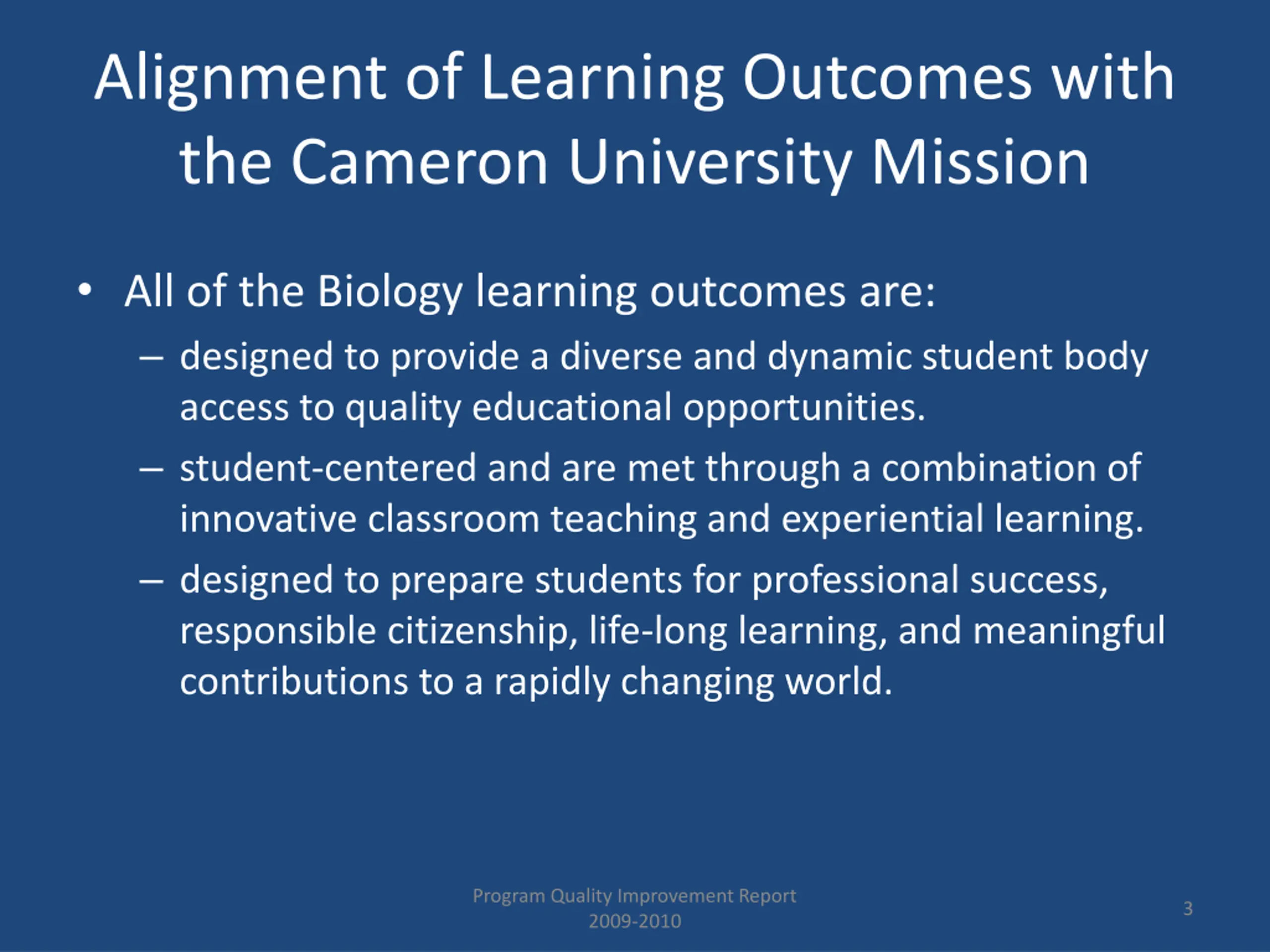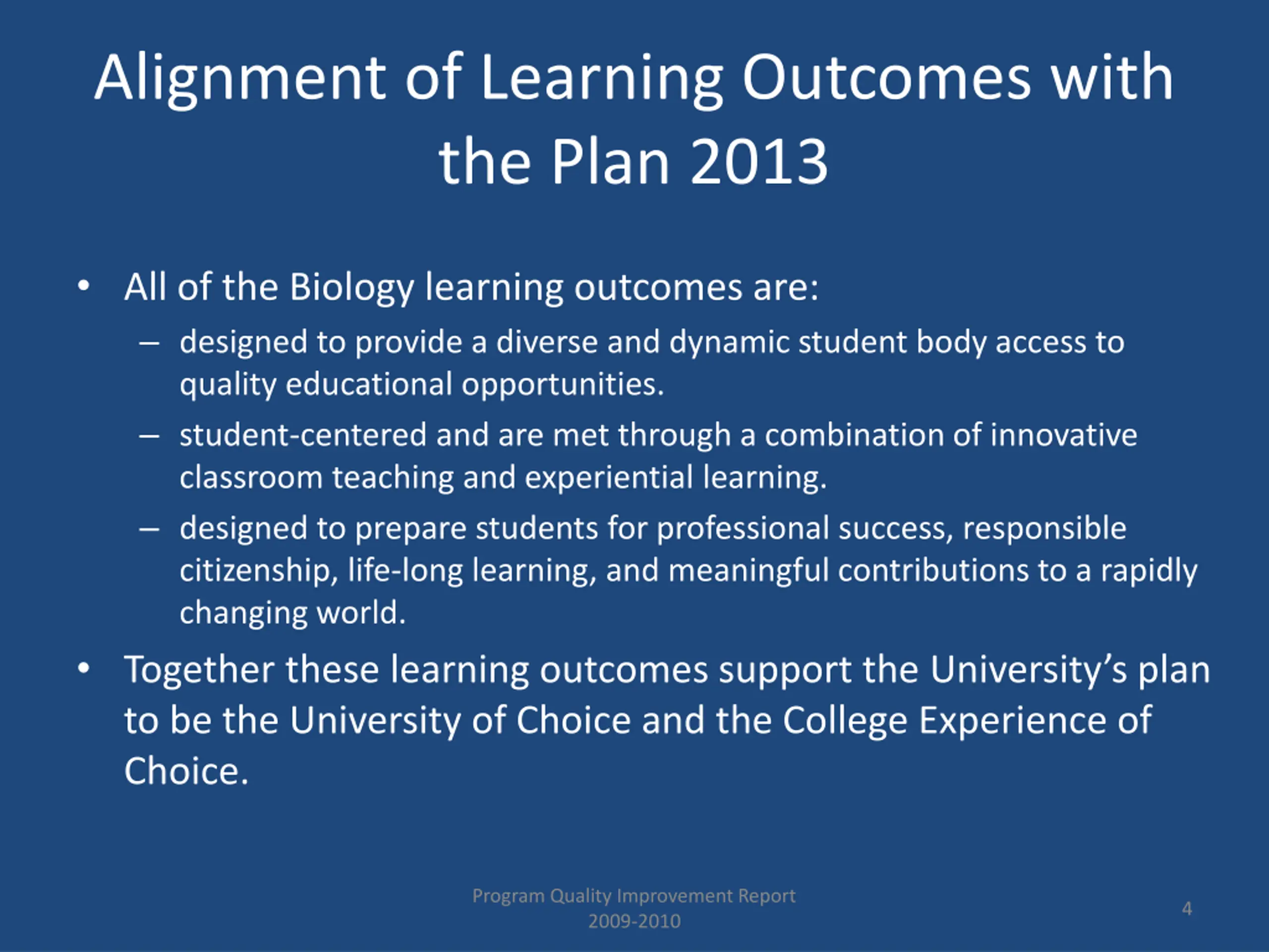 Alignment of Learning Outcomes with the Cameron University Mission All of the Biology learning outcomes are: designed to provide a diverse and dynamic student body access to quality educational opportunities. student-centered and are met through a combination of innovative classroom teaching and experiential learning. designed to prepare students for professional success, responsible citizenship, life-long learning, and meaningful contributions to a rapidly changing world. Program Quality Improvement Report 2009-2010 3