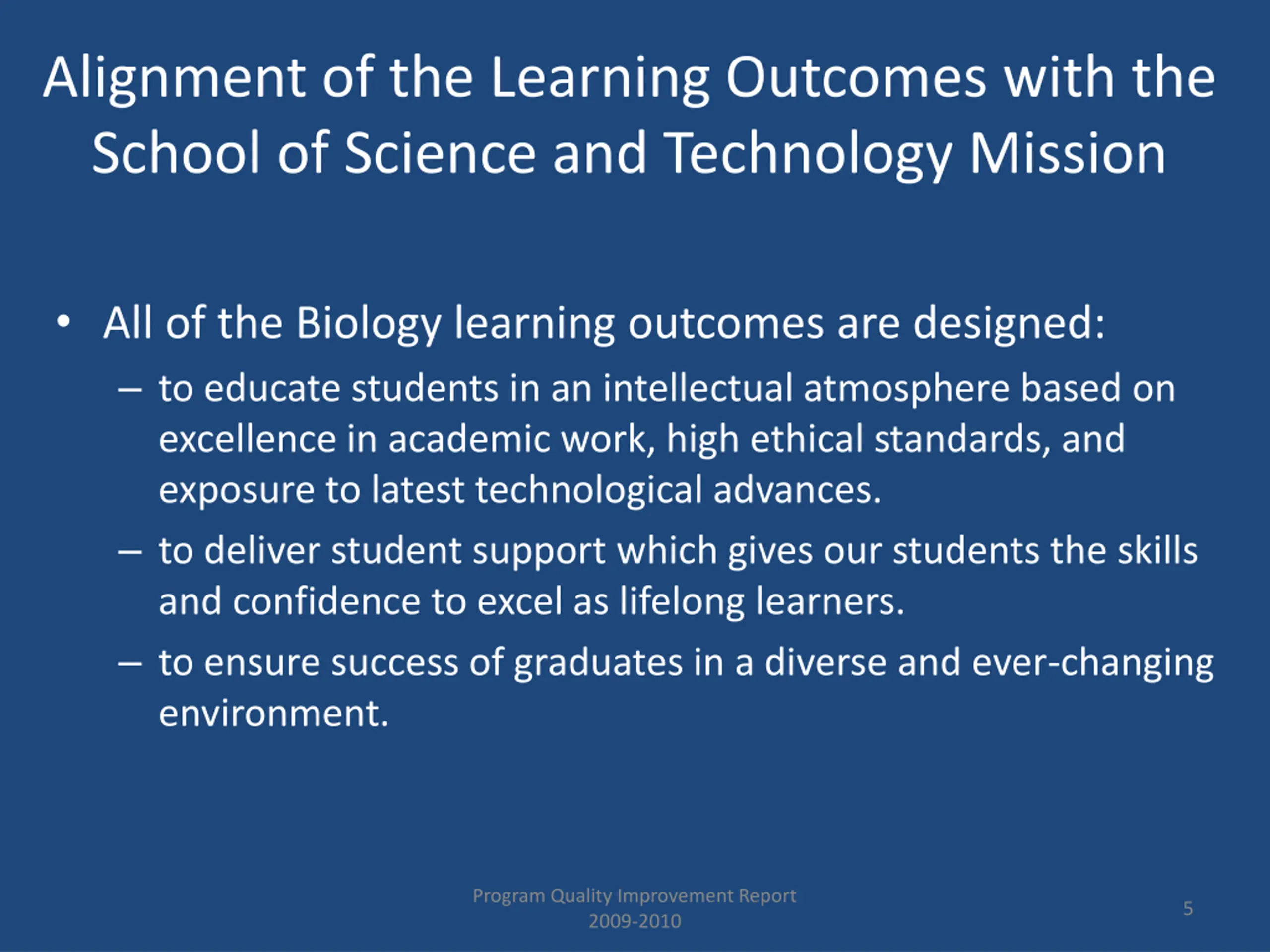 Alignment of the Learning Outcomes with the School of Science and Technology Mission All of the Biology learning outcomes are designed: to educate students in an intellectual atmosphere based on excellence in academic work, high ethical standards, and exposure to latest technological advances. to deliver student support which gives our students the skills and confidence to excel as lifelong learners. to ensure success of graduates in a diverse and ever-changing environment. Program Quality Improvement Report 2009-2010 5
