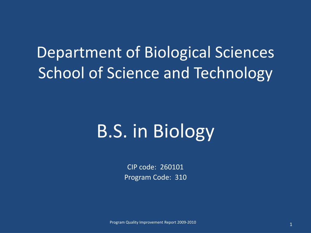 Department of Biological Sciences School of Science and Technology B.S. in Biology CIP code: 260101 Program Code: 310 Program Quality Improvement Report 2009-2010 1