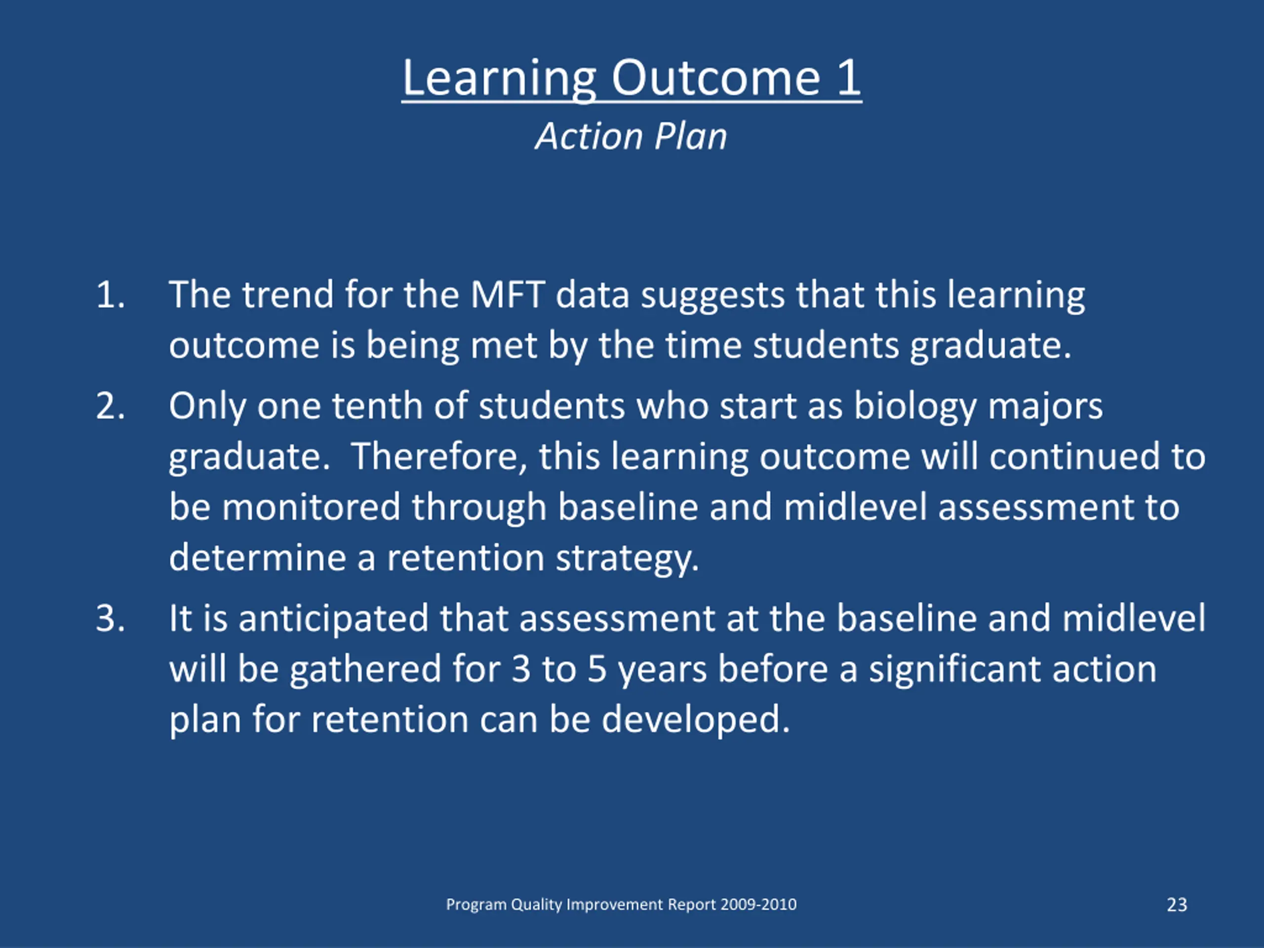 Learning Outcome 1 Action Plan 1. The trend for the MFT data suggests that this learning outcome is being met by the time students graduate. Only one tenth of students who start as biology majors graduate. Therefore, this learning outcome will continued to be monitored through baseline and midlevel assessment to determine a retention strategy. It is anticipated that assessment at the baseline and midlevel will be gathered for 3 to 5 years before a significant action plan for retention can be developed. 2. 3. 23 Program Quality Improvement Report 2009-2010