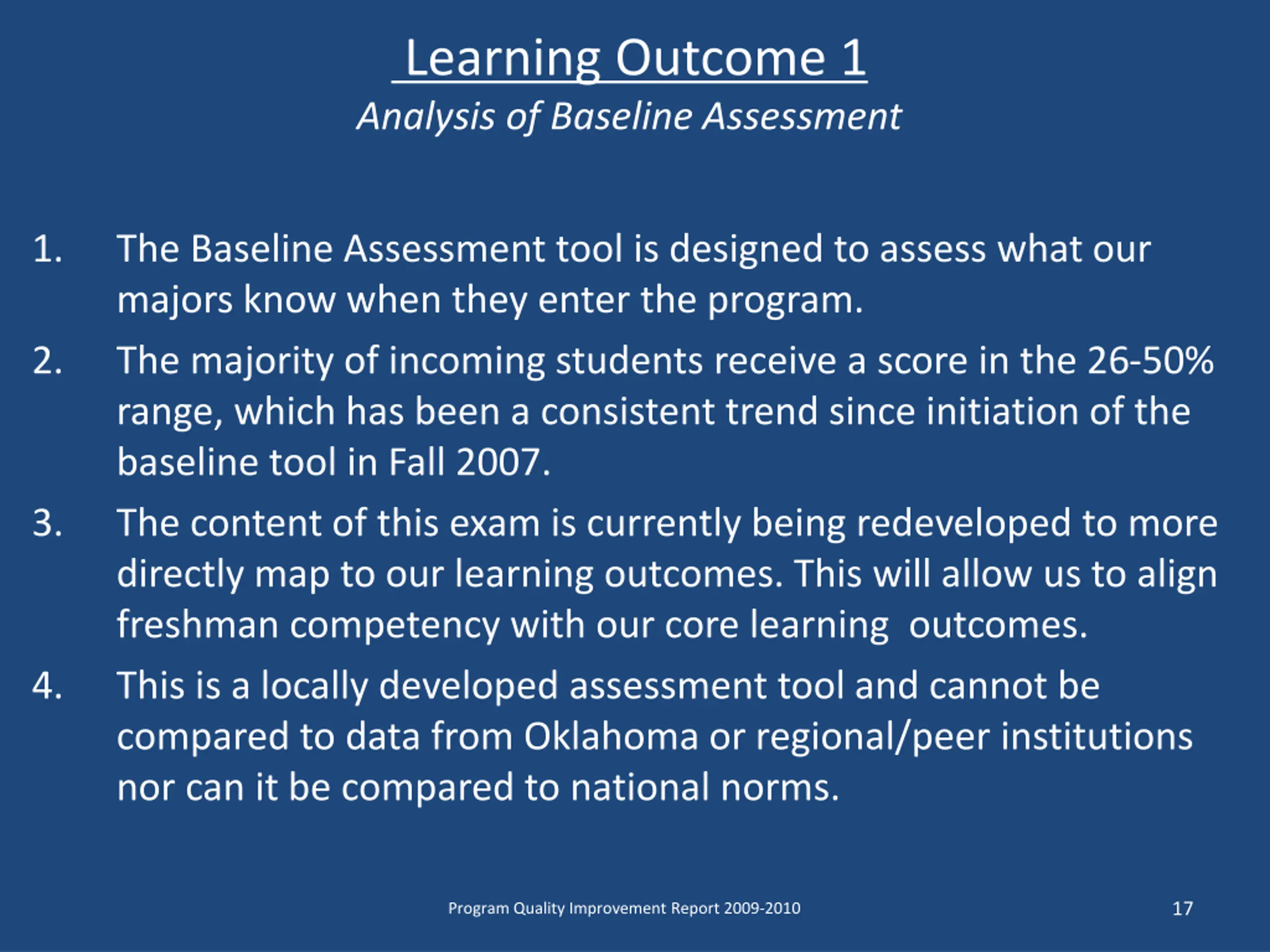 Learning Outcome 1 Analysis of Baseline Assessment 1. The Baseline Assessment tool is designed to assess what our majors know when they enter the program. The majority of incoming students receive a score in the 26-50% range, which has been a consistent trend since initiation of the baseline tool in Fall 2007. The content of this exam is currently being redeveloped to more directly map to our learning outcomes. This will allow us to align freshman competency with our core learning outcomes. This is a locally developed assessment tool and cannot be compared to data from Oklahoma or regional/peer institutions nor can it be compared to national norms. 2. 3. 4. 17 Program Quality Improvement Report 2009-2010